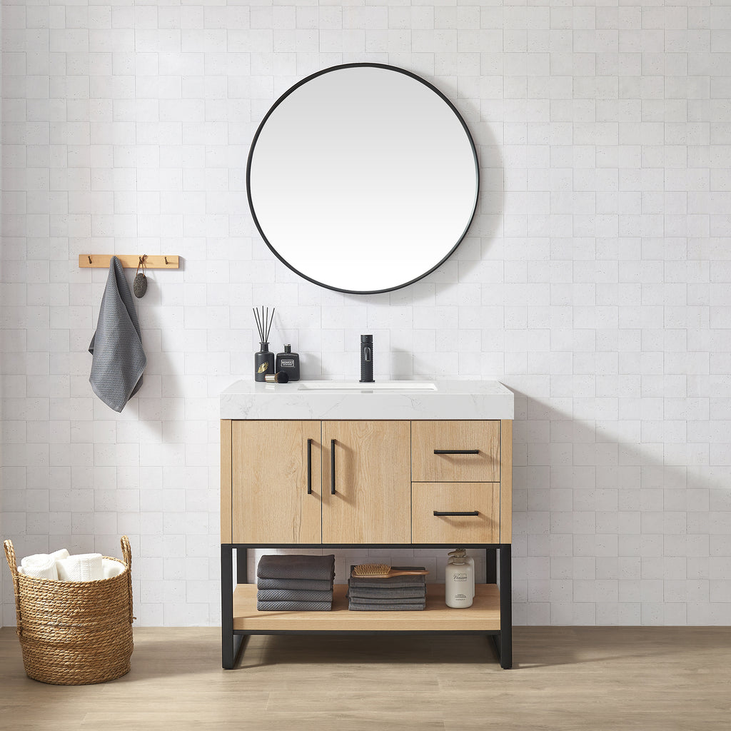 Kolkata 36B" Single Sink Bath Vanity in Weathered Oak with White Grain Composite Stone Top