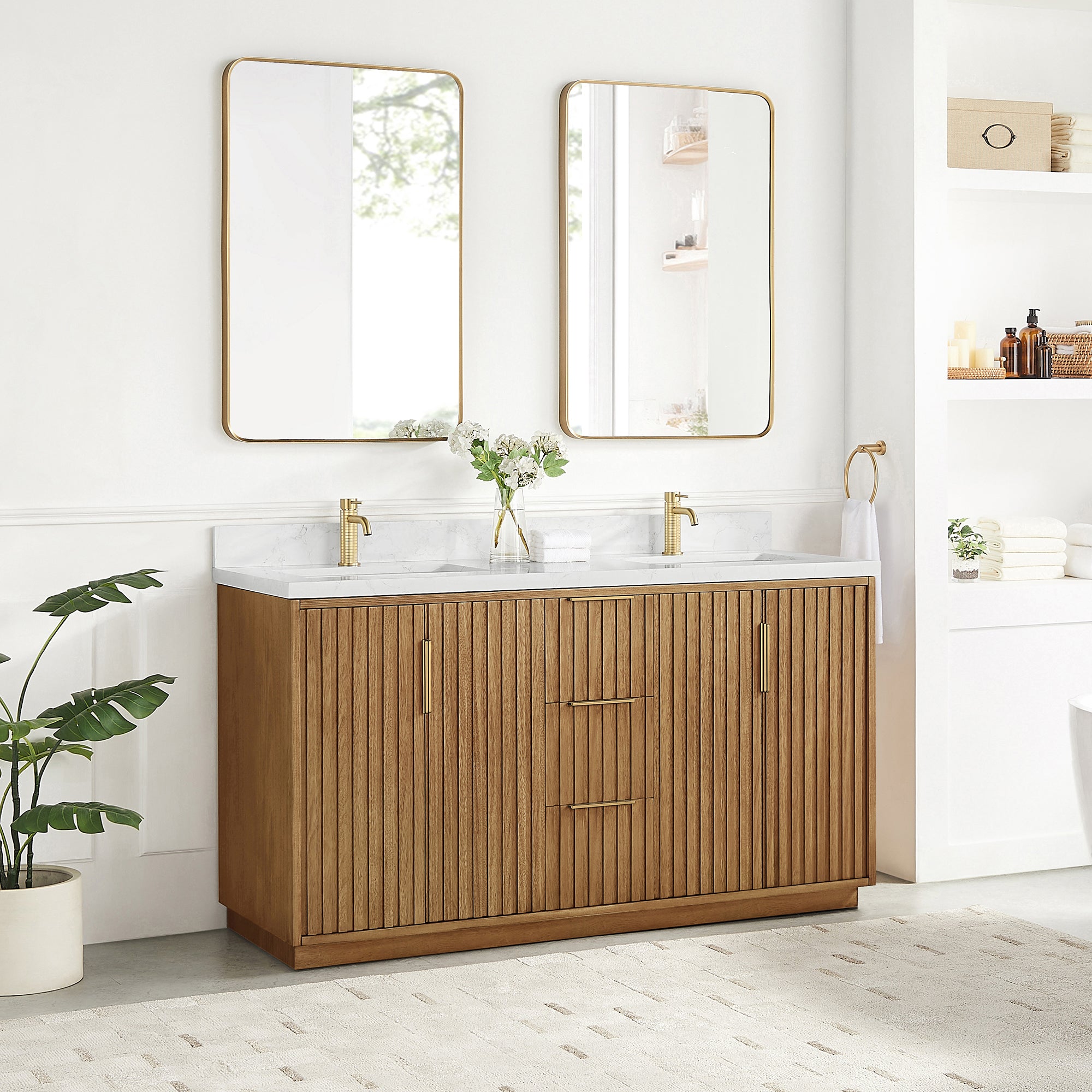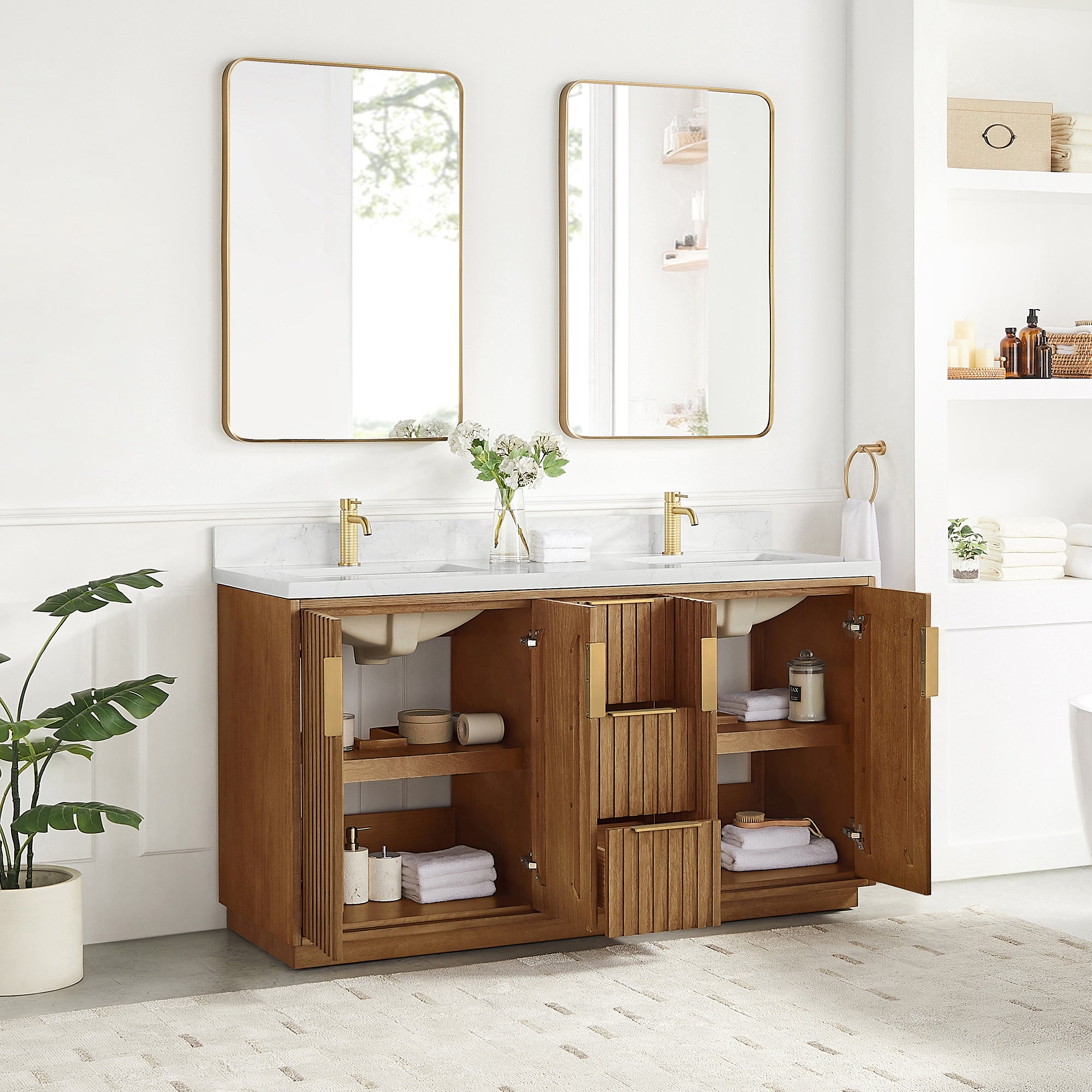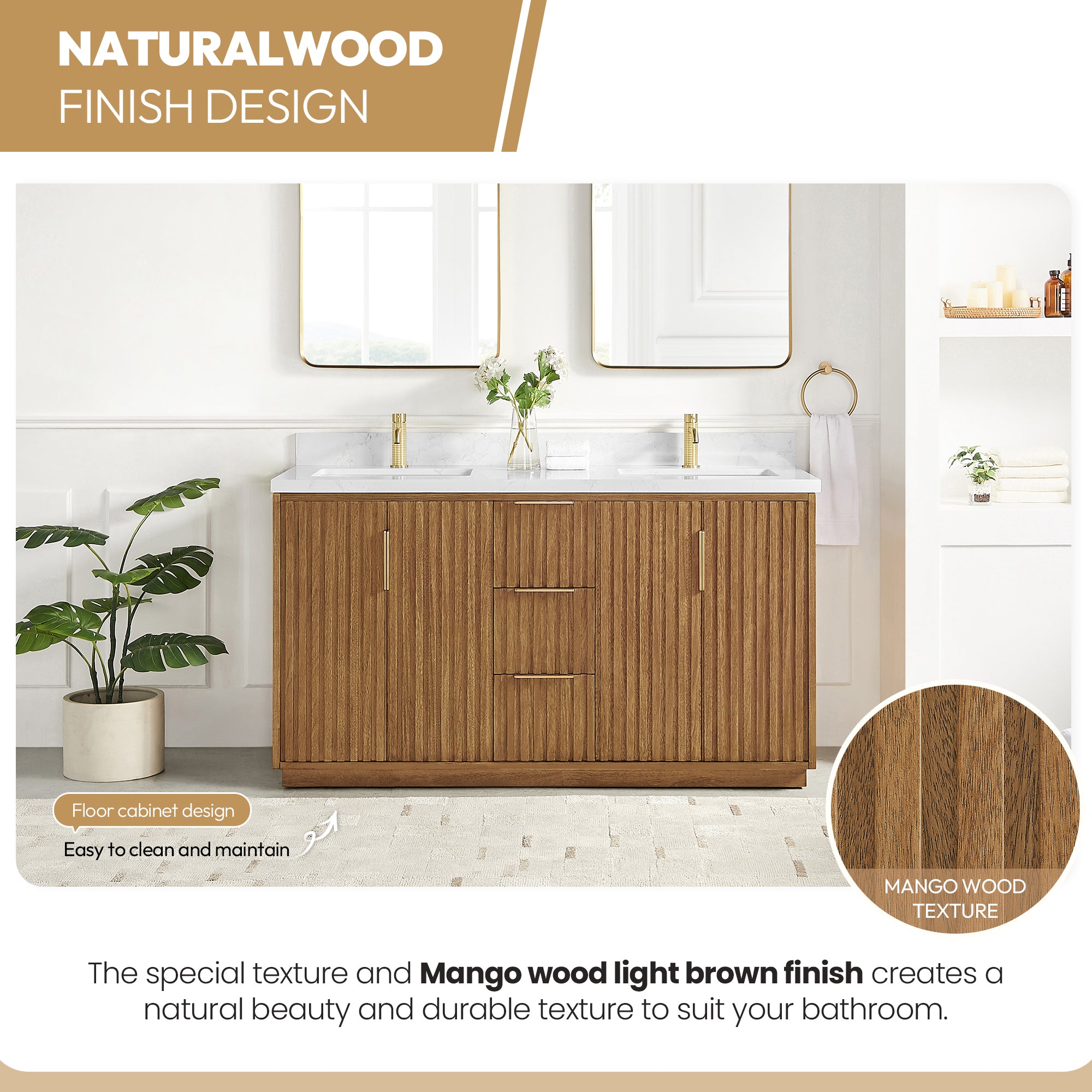 Bangkok 60" Double Sink Bath Vanity in Mango Wood Light Brown with White Grain Composite Stone Top