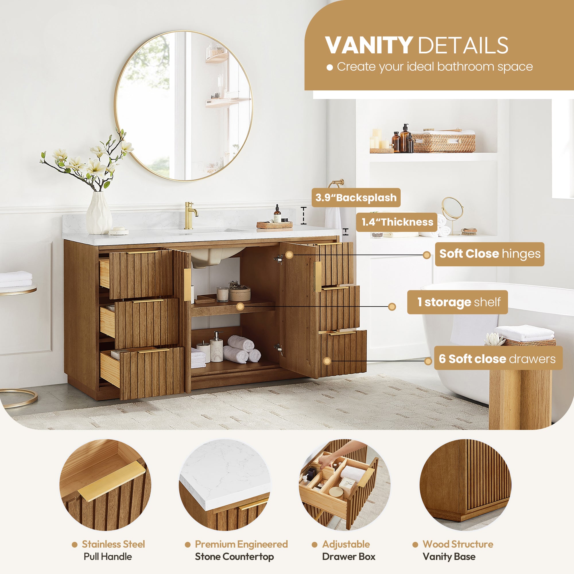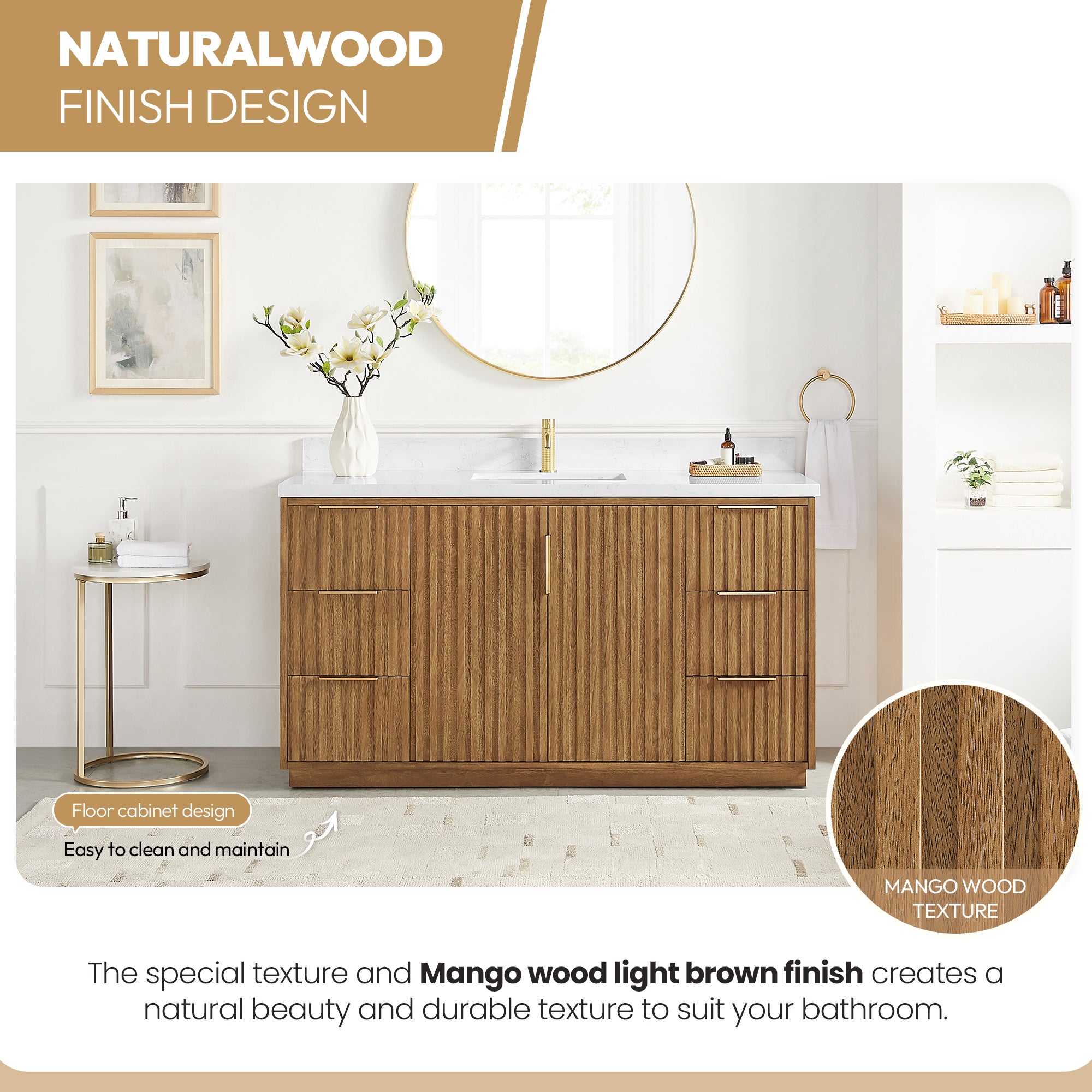 Bangkok 60" Single Sink Bath Vanity in Mango Wood Light Brown with White Grain Composite Stone Top