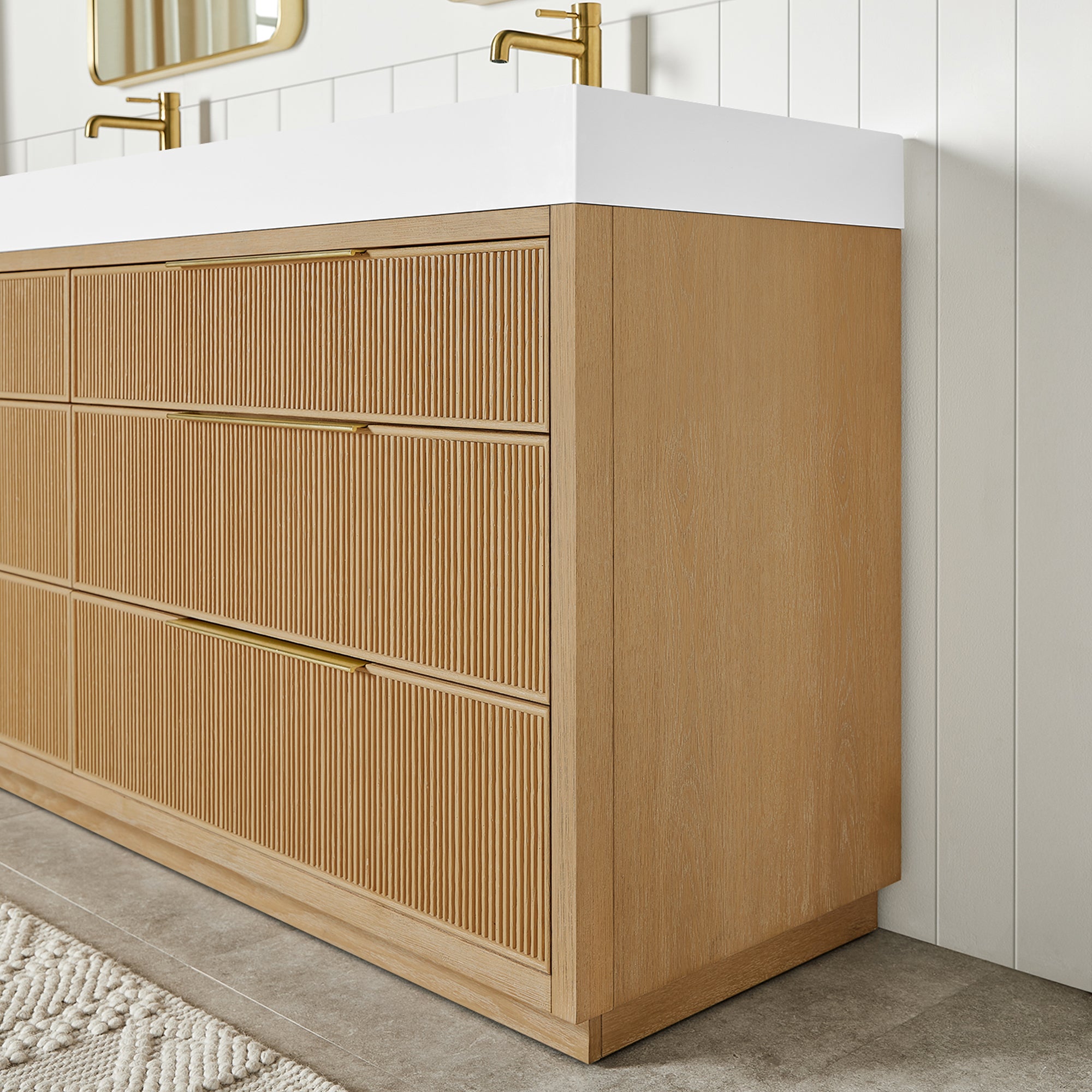 Want to level-up your guest or master bath? Choose a vanity that marries durable craftsmanship with stylish sophistication. Crafted from imported solid wood and tastefully finished, our Hohhot Series Vanity exudes both elegance and simplicity. Its hand-spliced dovetail drawers feature beautifully textured bamboo rattan panels as well as generous storage for essentials. A luxuriously thick, bold-white countertop crowns the cabinet to lend eye-catching contrast.