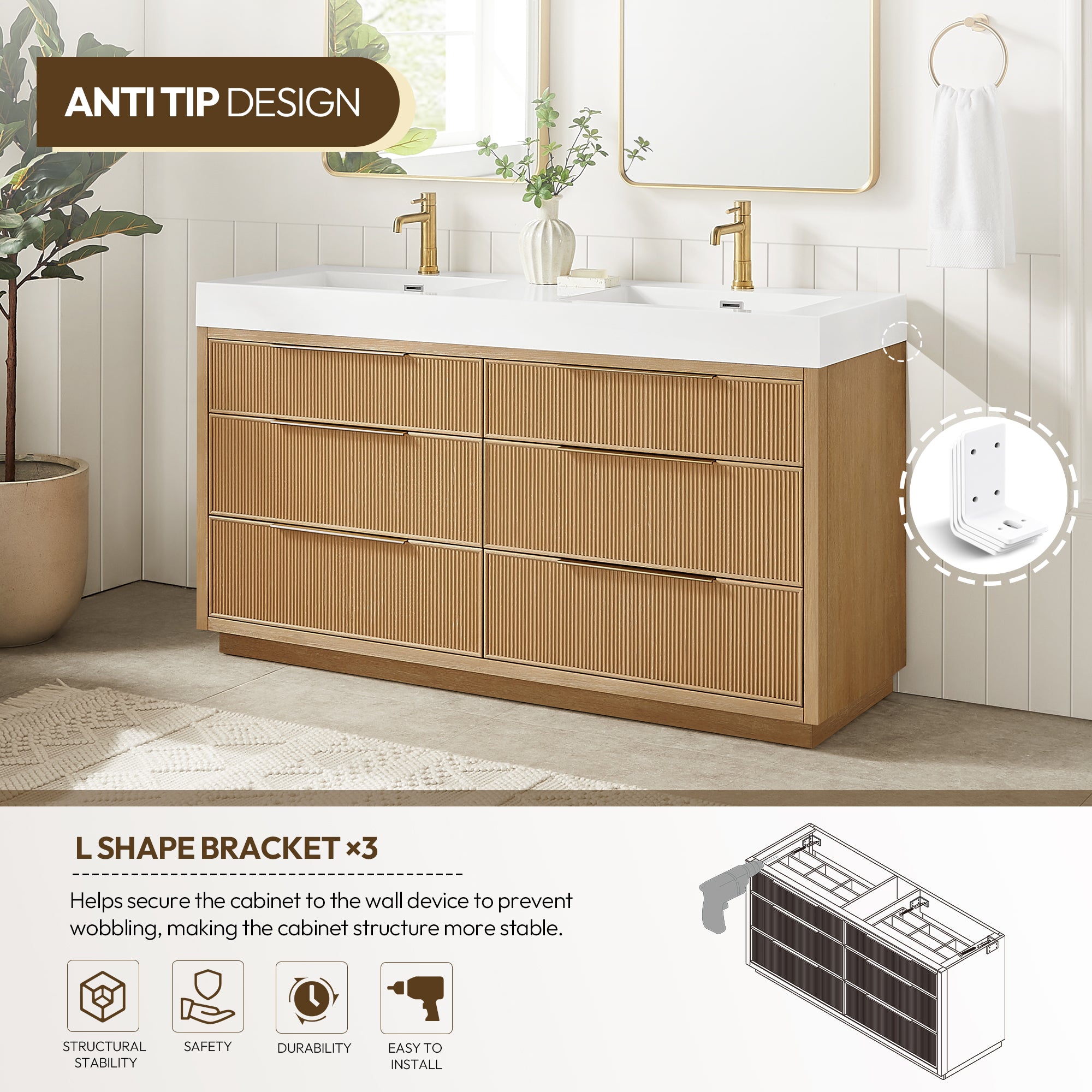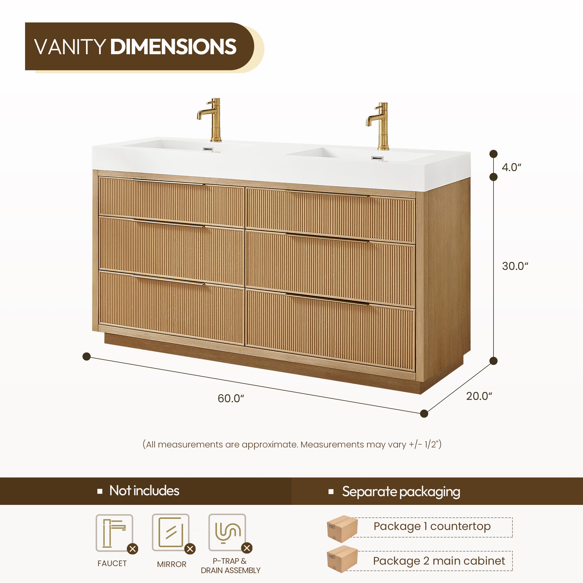 Hohhot 60M" Free-standing Double Bath Vanity in Washed Ash Grey with White Integrated Stone Sink Top