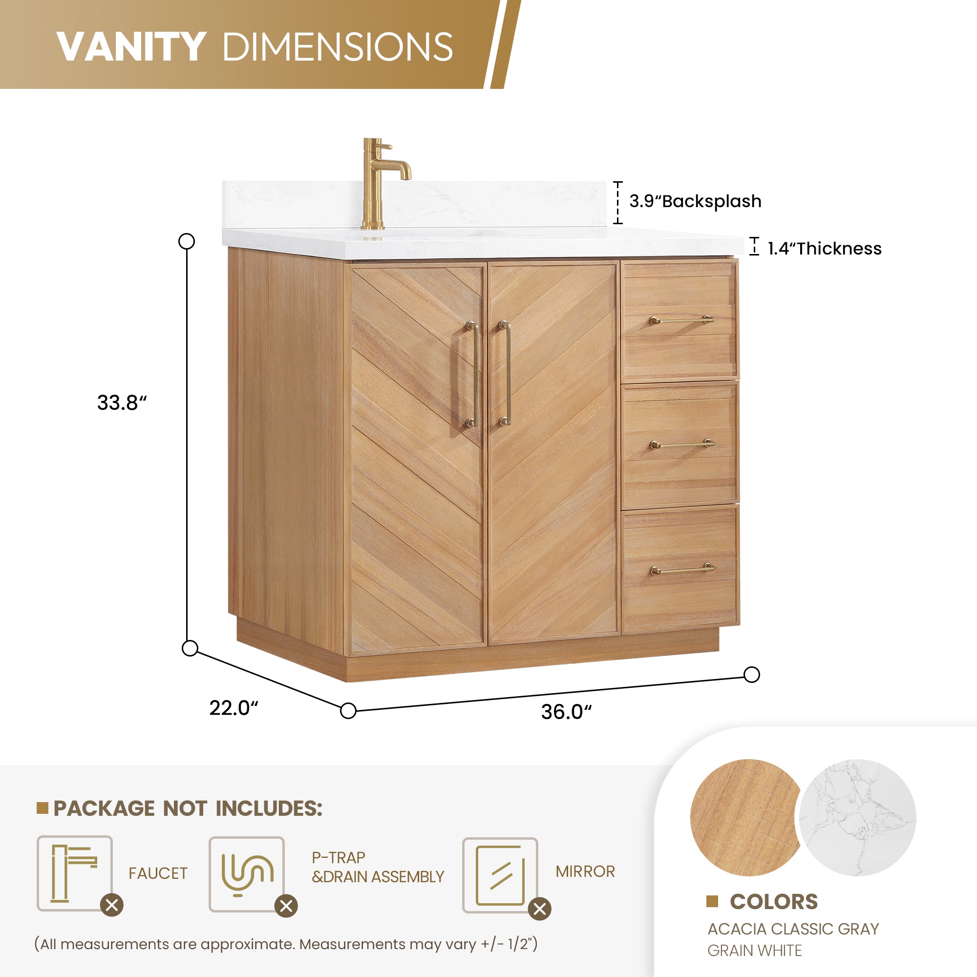 Karachi 36" Single Sink Bath Vanity in Acacia Classic Gray with White Grain Composite Stone Top