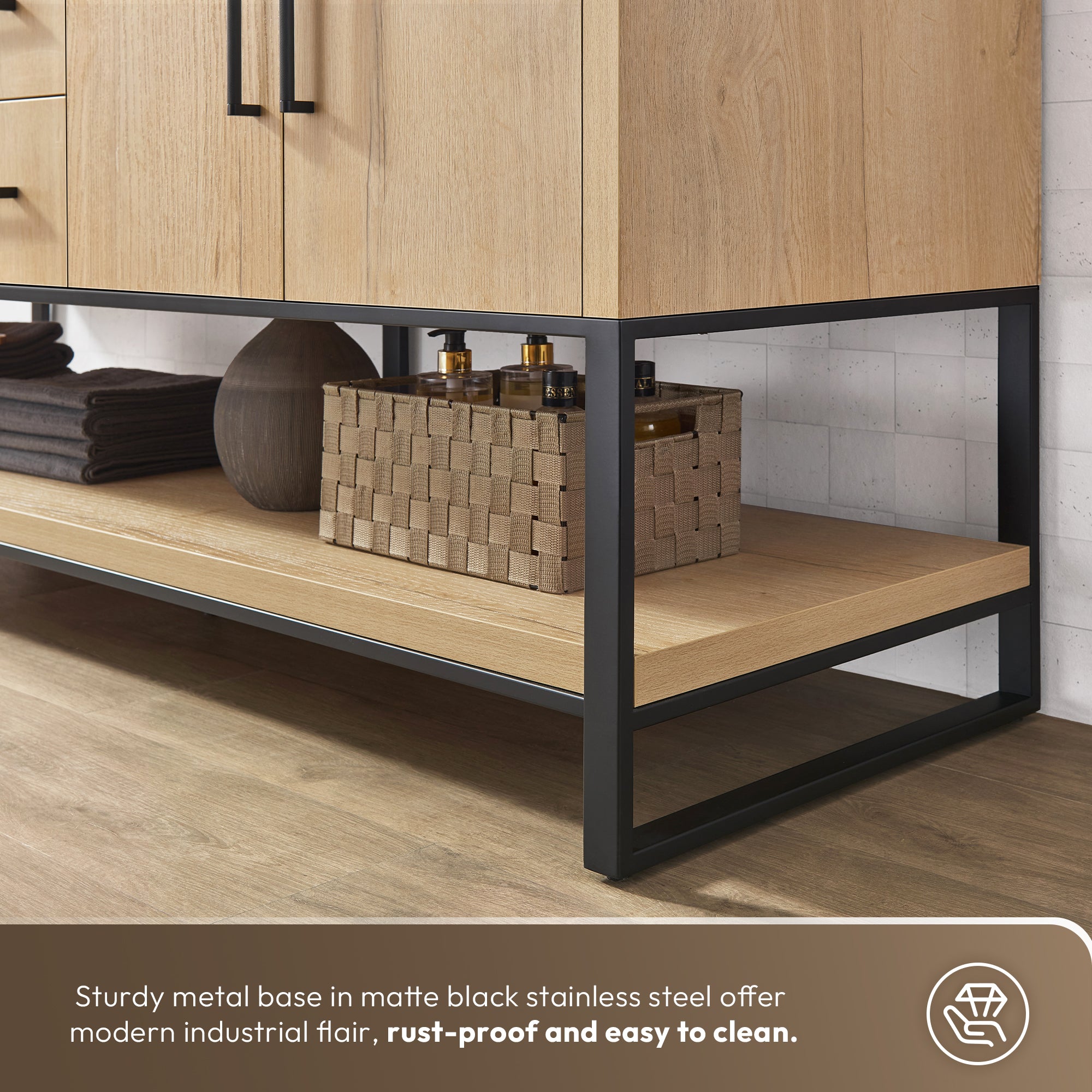 - Stunning Finish: Available in a beautiful Weathered Oak finish with a Matte Black or Brushed Gold stainless steel bracket to complement your décor.