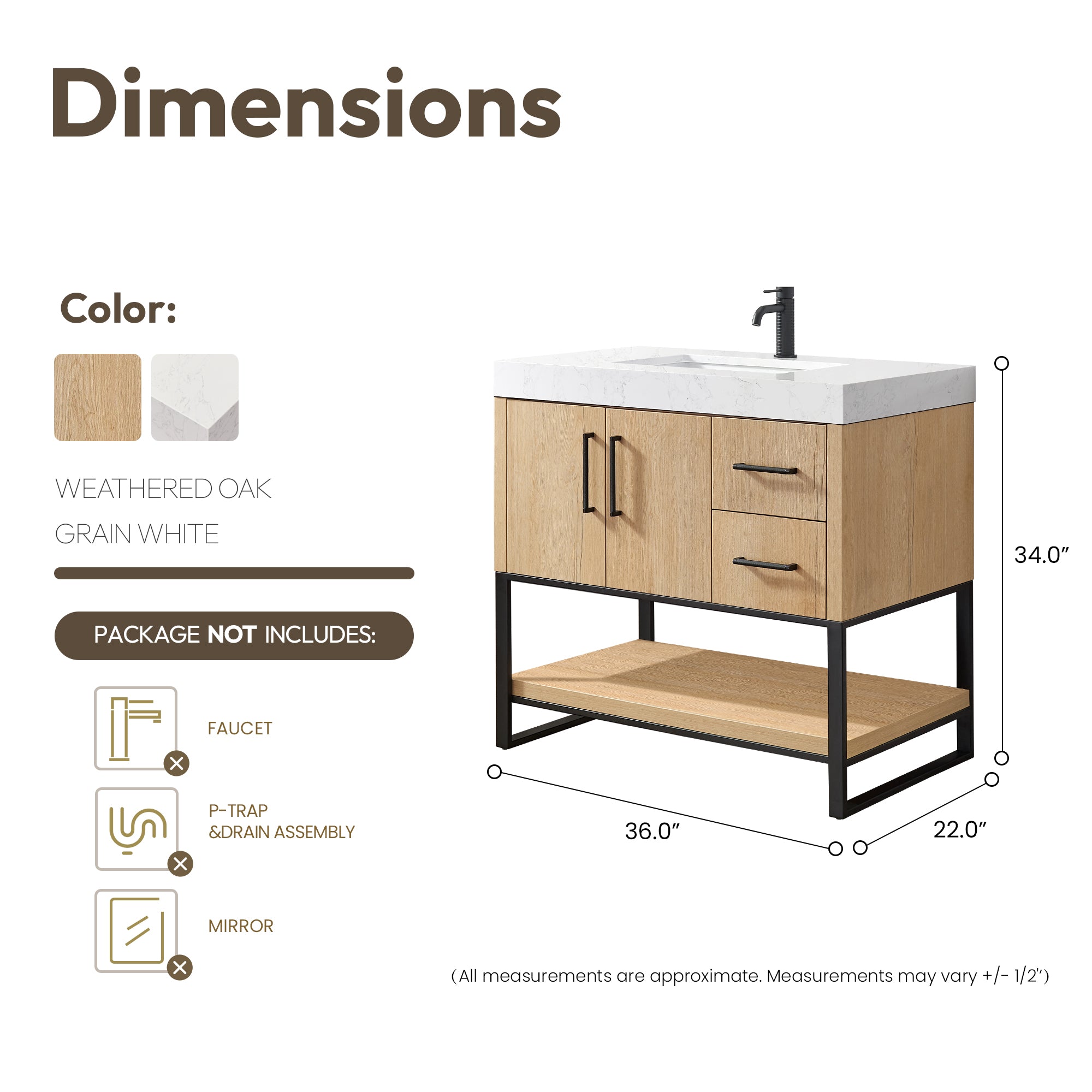 - Accessories: Does not include mirror, faucet, drain assembly, backsplash, P-trap, or storage cabinet.