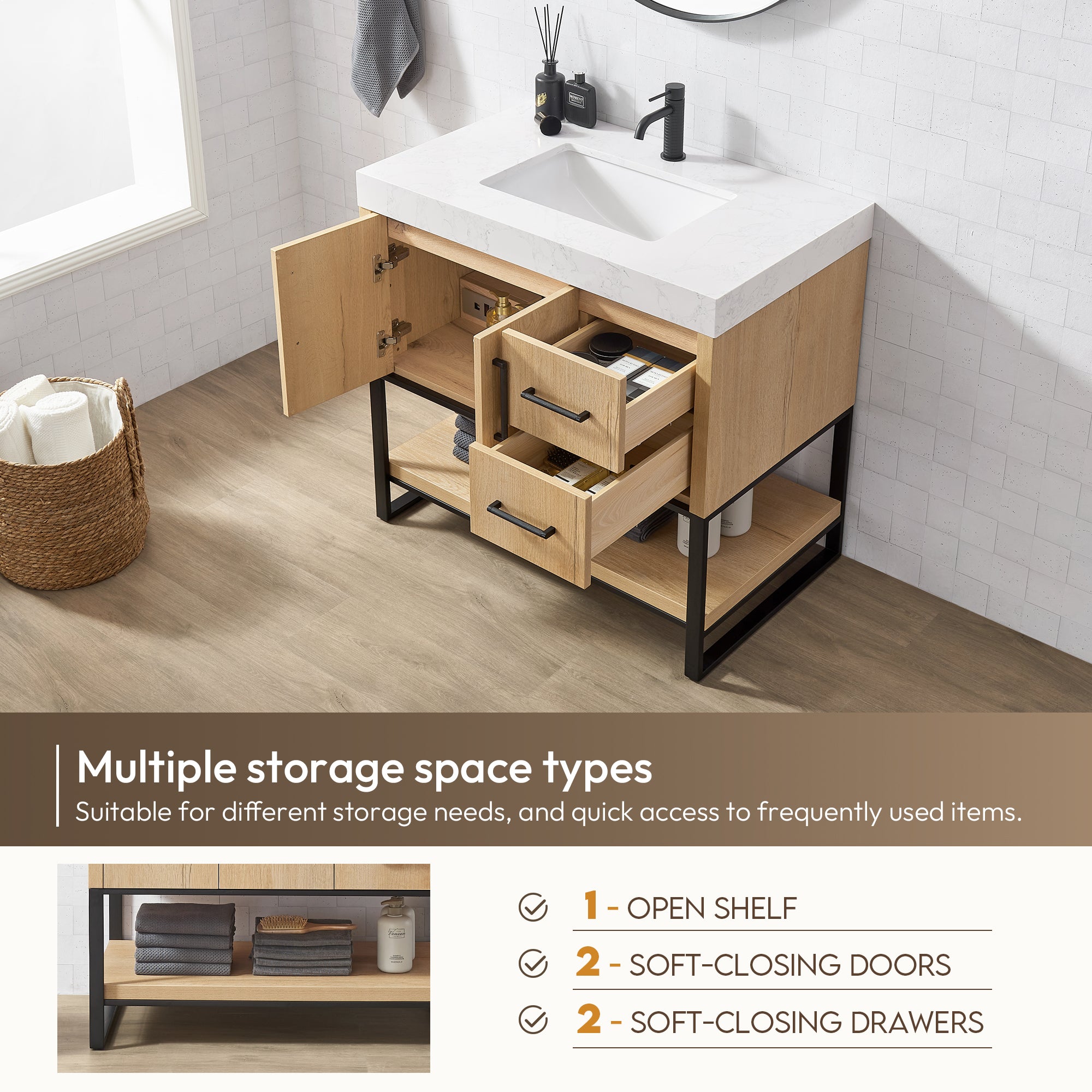 - Ample Storage Space: Two soft-closing doors and two soft-closing drawers along with a fixed open shelf offer ample space for all your toiletries.