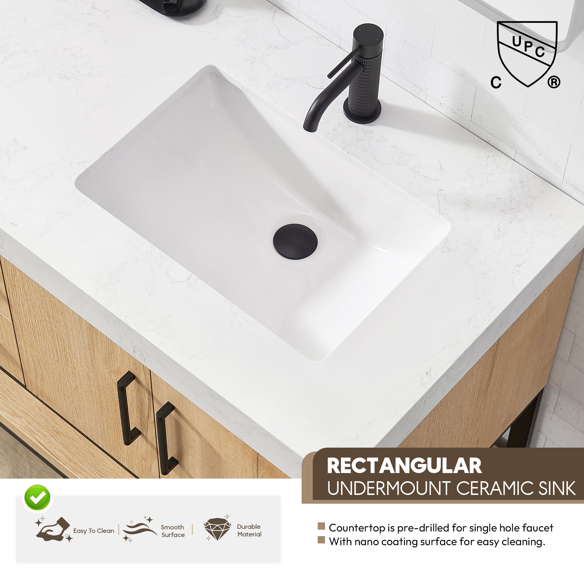 - Nano-Coated Basin: Bright-white ceramic undermount sink with Nano anti-fouling coating and overflow blends seamlessly with the stone vanity top.