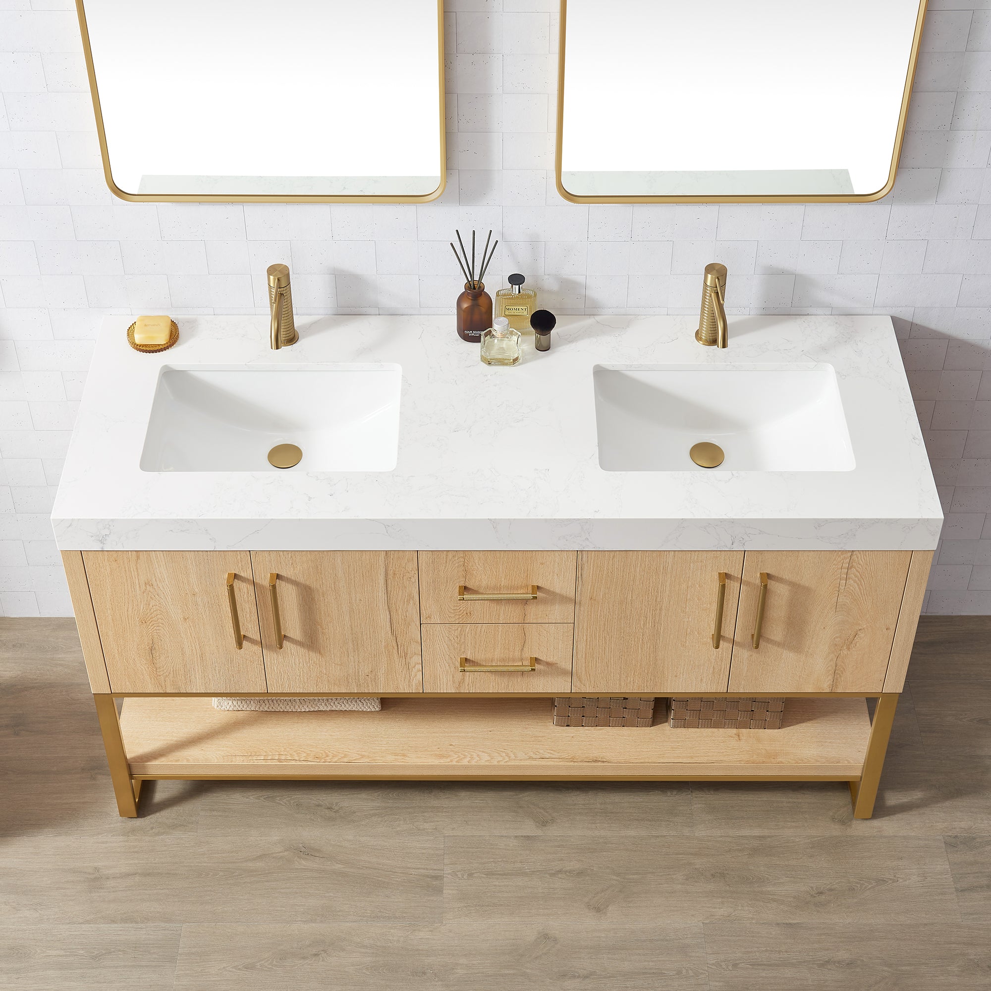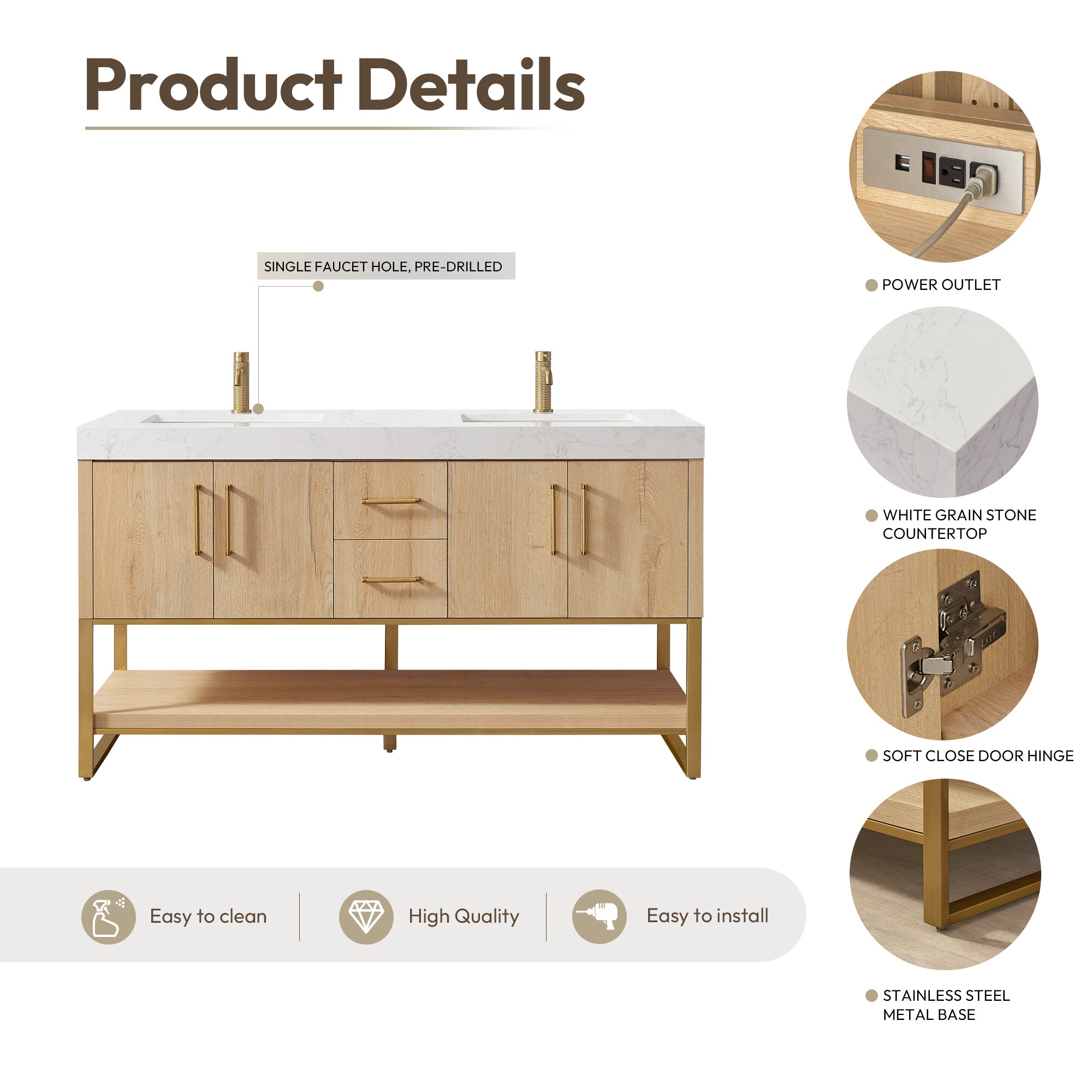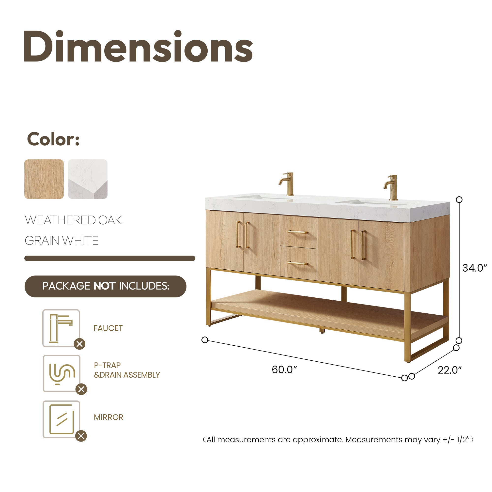 Kolkata 60M" Double Sink Bath Vanity in Weathered Oak with White Grain Composite Stone Top