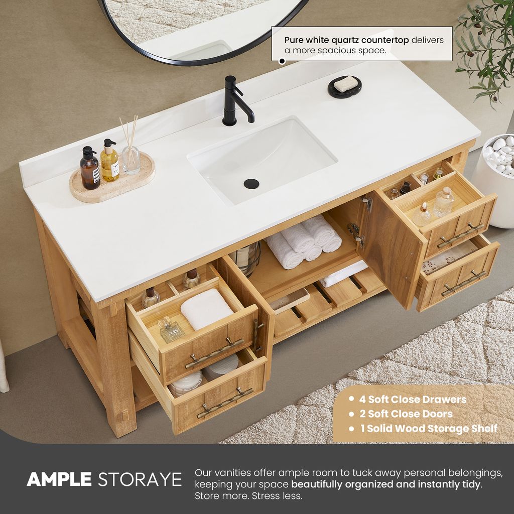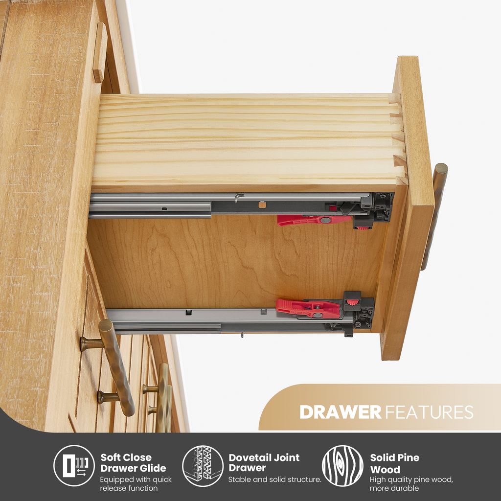 - Ample Storage Space: Two soft-closing doors and four sturdy, soft-closing dovetail drawers offer ample space for all your toiletries. Fixed sturdy solid wood bottom base shelves and built-in partition storage space in the drawers allow you to keep toiletries and other items neatly organized.