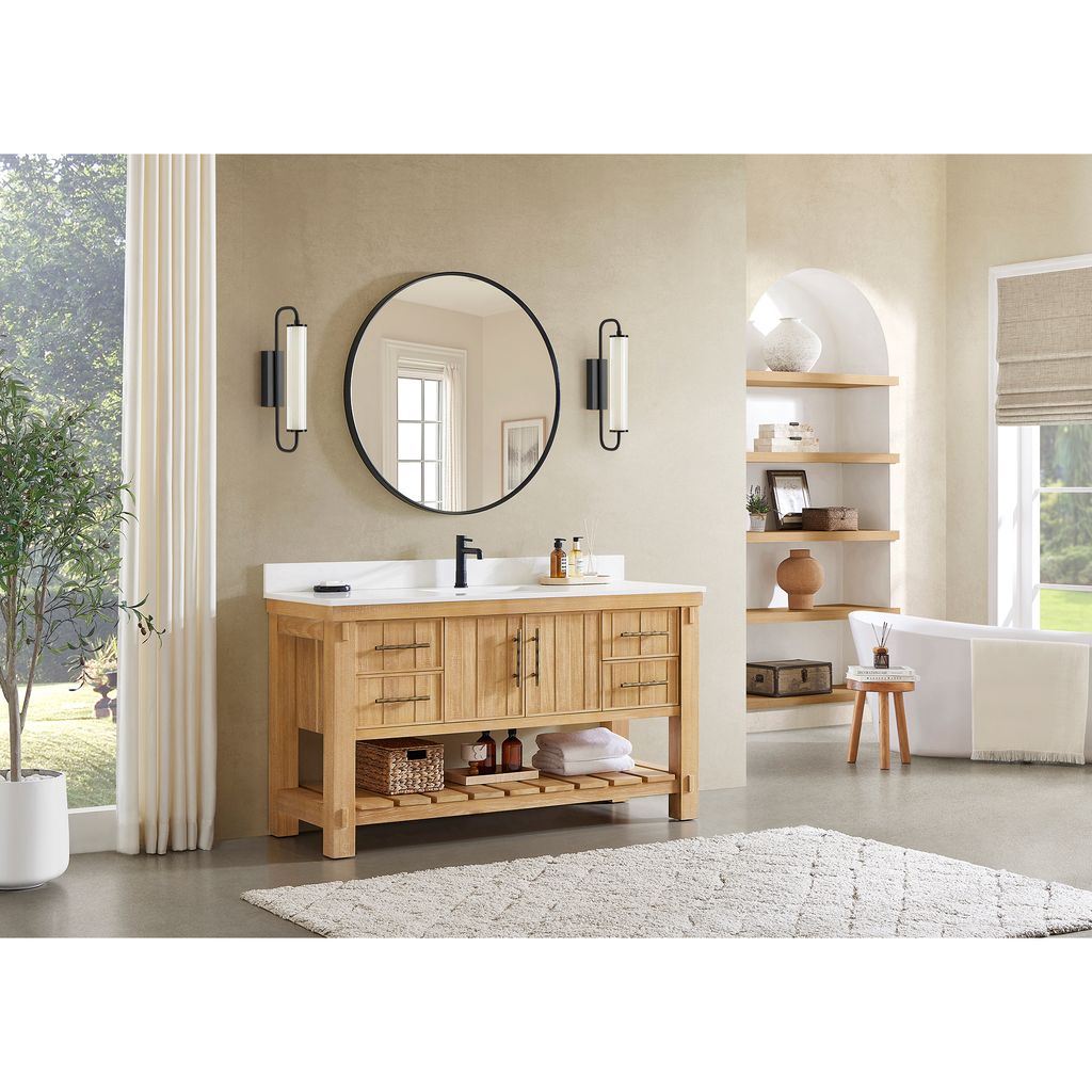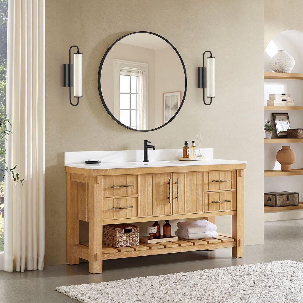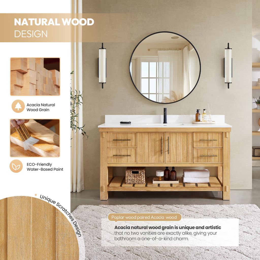 Transform your bathroom’s aesthetic with the refined beauty and strength of this expertly crafted piece. Made from imported solid wood set off by a crisp white countertop, our Paris Vanity brings a sense of grounded elegance to any space. Thoughtfully designed for both beauty and function, it offers smart storage to keep essentials neatly organized. Bronze hardware accentuates the cabinet’s clean lines and bold grain pattern, creating a stylish finish. "Our vanity showcases the natural beauty of acacia wood grain, featuring organic swirls and rich tonal variations that make each piece uniquely elegant."