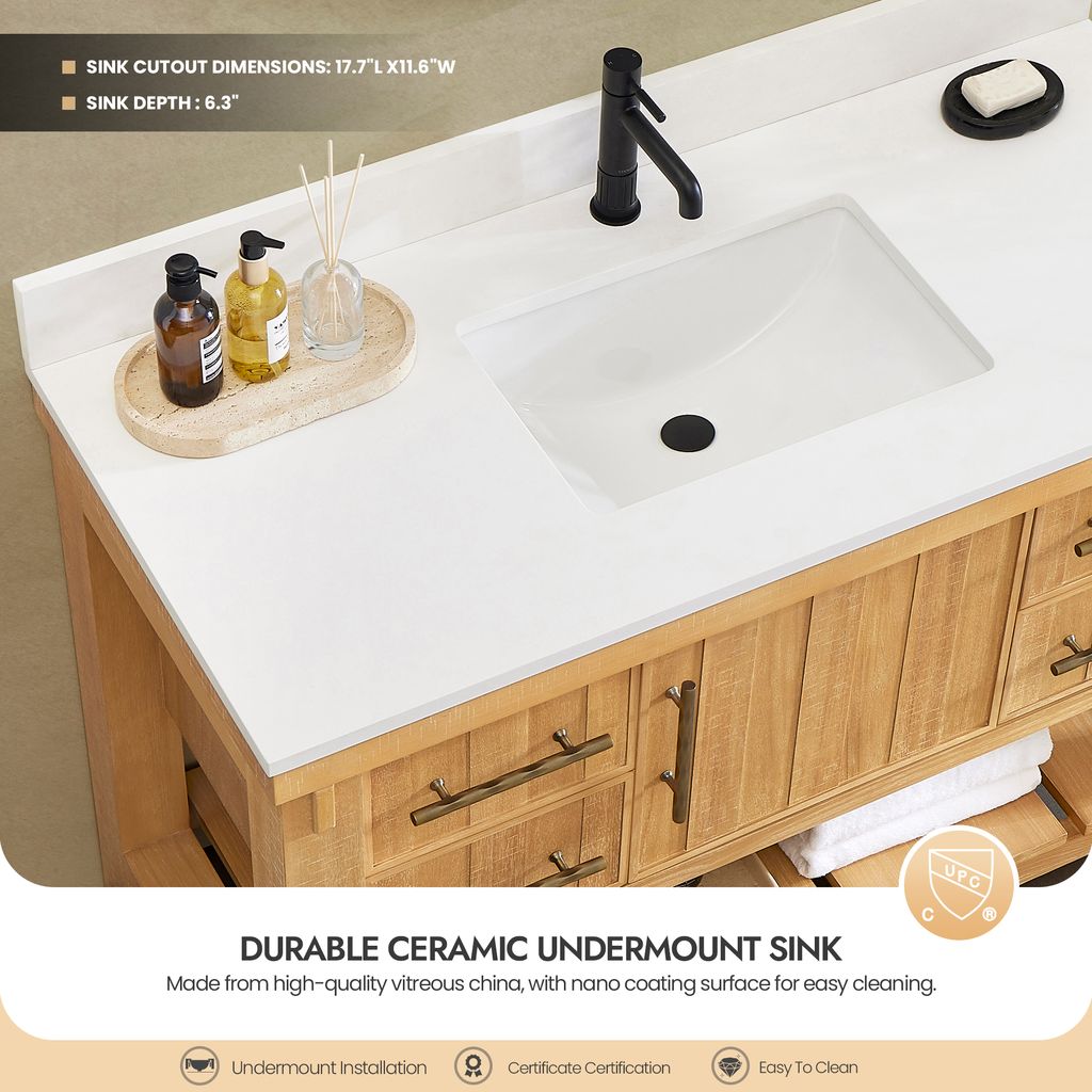 - Nano-Coated Basin: Bright white Nano anti-fouling coating durable ceramic undermount sink with overflow blends seamlessly with the stone vanity top.