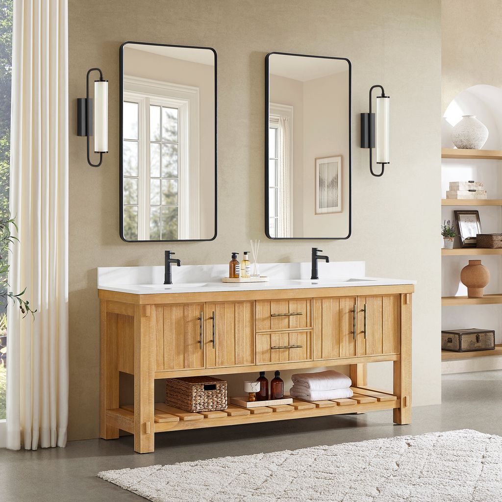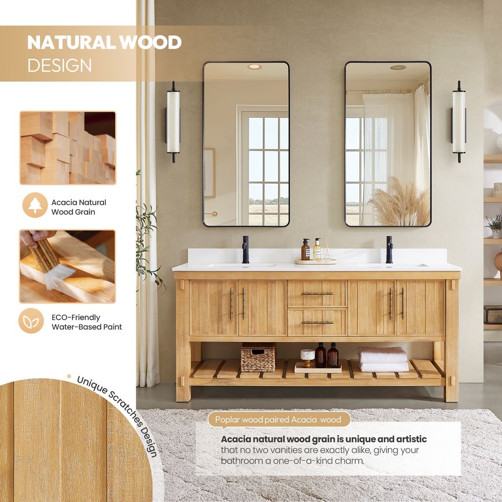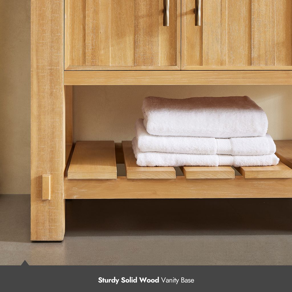 Transform your bathroom’s aesthetic with the refined beauty and strength of this expertly crafted piece. Made from imported solid wood set off by a crisp white countertop, our Paris Vanity brings a sense of grounded elegance to any space. Thoughtfully designed for both beauty and function, it offers smart storage to keep essentials neatly organized. Bronze hardware accentuates the cabinet’s clean lines and bold grain pattern, creating a stylish finish. "Our vanity showcases the natural beauty of acacia wood grain, featuring organic swirls and rich tonal variations that make each piece uniquely elegant."