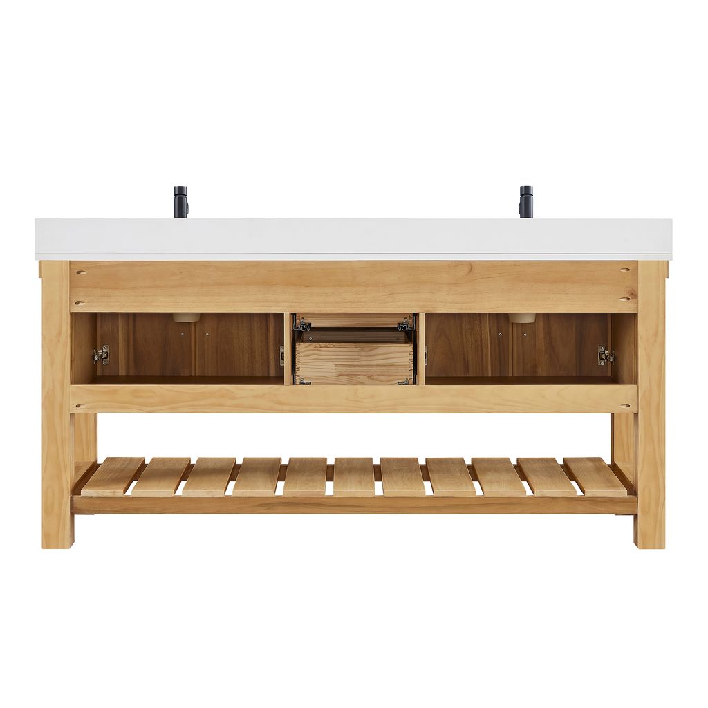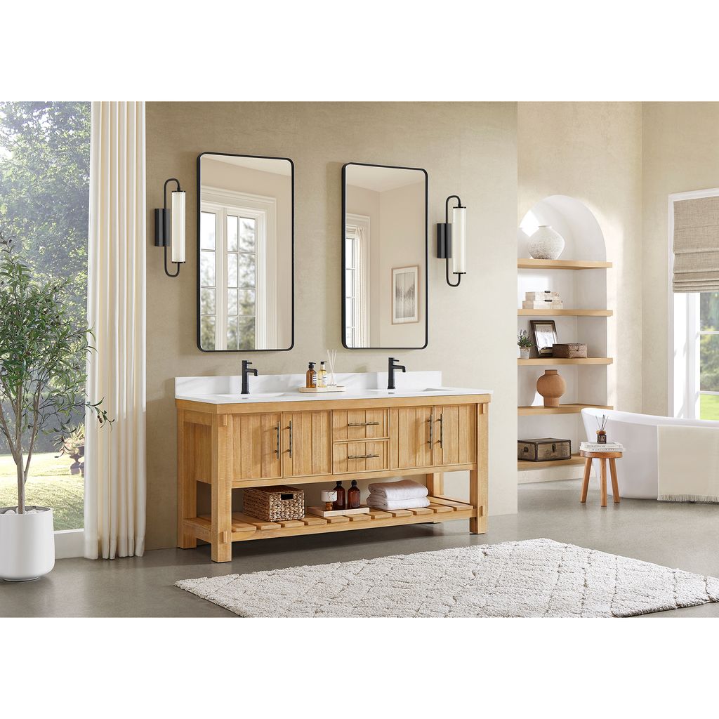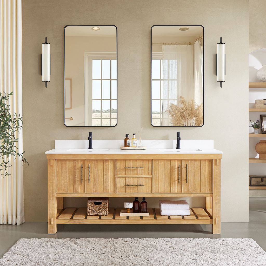 Transform your bathroom’s aesthetic with the refined beauty and strength of this expertly crafted piece. Made from imported solid wood set off by a crisp white countertop, our Paris Vanity brings a sense of grounded elegance to any space. Thoughtfully designed for both beauty and function, it offers smart storage to keep essentials neatly organized. Bronze hardware accentuates the cabinet’s clean lines and bold grain pattern, creating a stylish finish. "Our vanity showcases the natural beauty of acacia wood grain, featuring organic swirls and rich tonal variations that make each piece uniquely elegant."