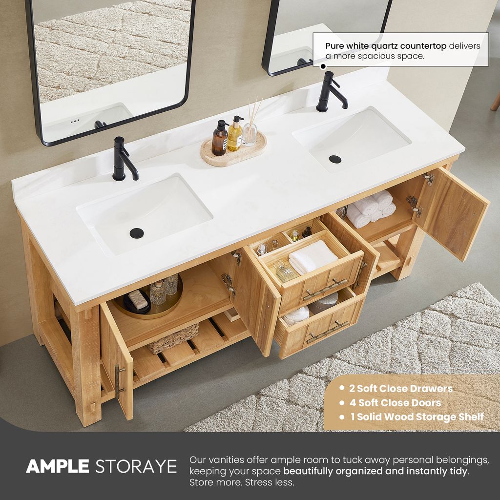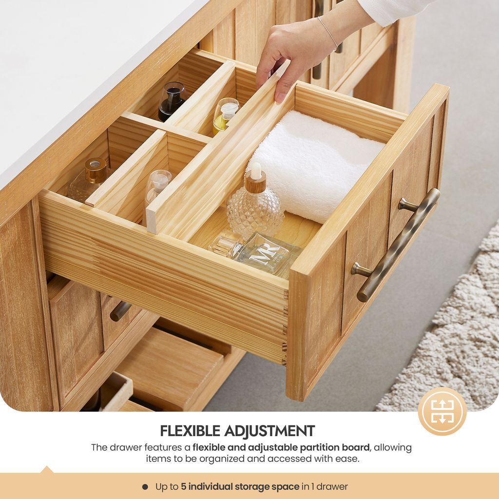 - Ample Storage Space: Four soft-closing doors and two sturdy, soft-closing dovetail drawers offer ample space for all your toiletries. Fixed sturdy solid wood bottom base shelves and built-in partition storage space in the drawers allow you to keep toiletries and other items neatly organized.