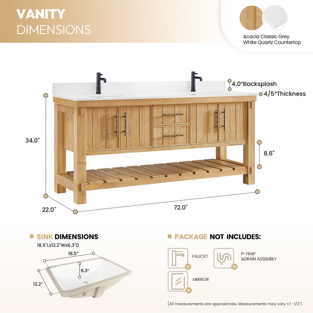 - Accessories: Does not include mirror, faucet, drain assembly, P-trap, or storage cabinet.