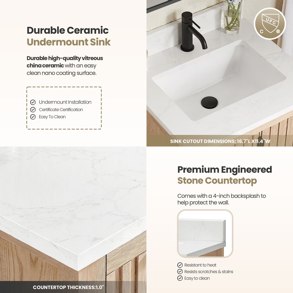 - Nano-Coated Basin: Bright white Nano anti-fouling coating ceramic undermount sink with overflow blends seamlessly with the stone vanity top.