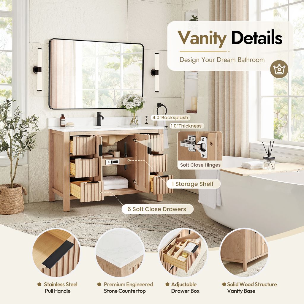 - Ample Storage Space: Two soft-closing, hand-spliced doors (door panel with anti-warping reinforcement strip) with fixed shelves and six sturdy, hand-spliced, soft-closing dovetail drawers offer ample space for all your toiletries. Built-in partition storage space in the drawer allows you to keep toiletries and other items neatly organized.