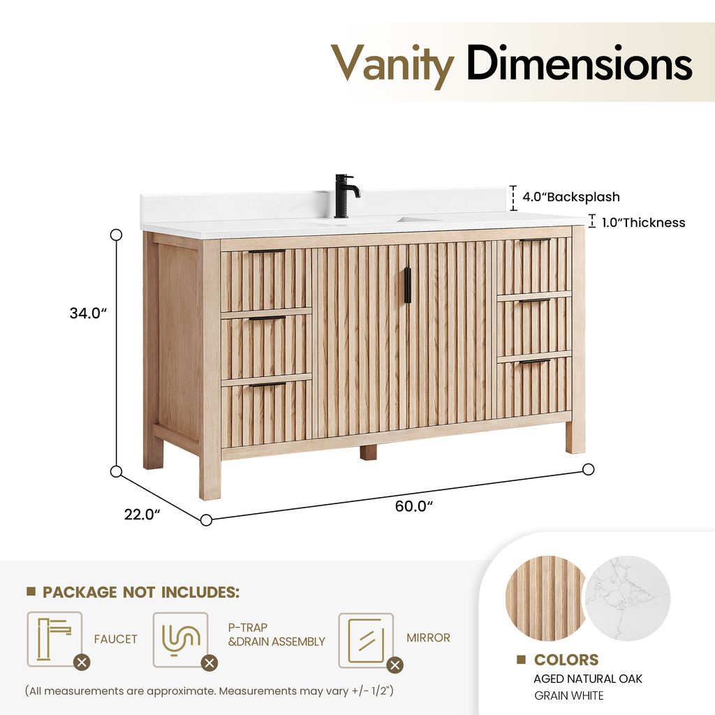 - Accessories: Does not include mirror, faucet, drain assembly, P-trap, or storage cabinet. Comes fully assembled and ready to install in your bathroom.