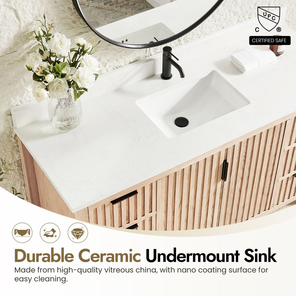 - Nano-Coated Basin: Bright white Nano anti-fouling coating ceramic undermount sink with overflow blends seamlessly with the stone vanity top.