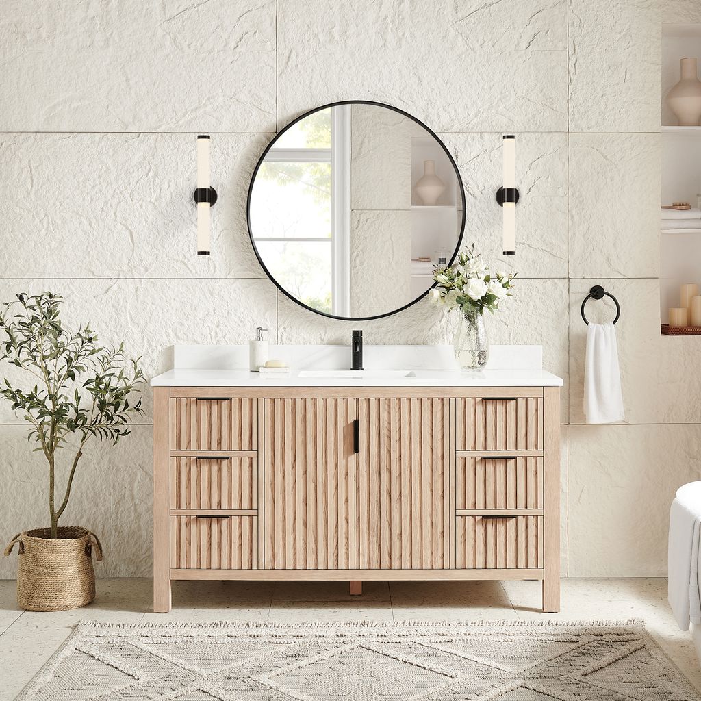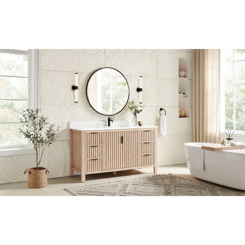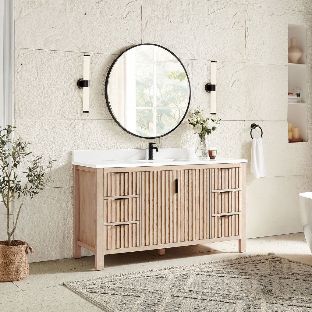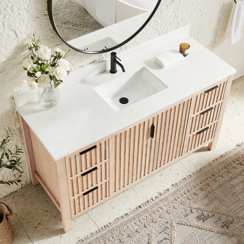 Shenzhen 60" Single Sink Bath Vanity in Aged Natural Oak with White Grain Composite Stone Top