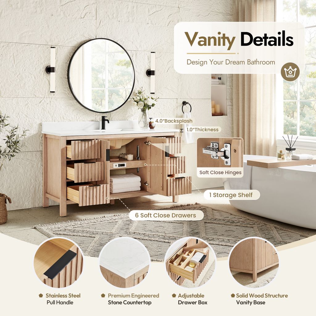 - Ample Storage Space: Two soft-closing, hand-spliced doors (door panel with anti-warping reinforcement strip) with fixed shelves and six sturdy, hand-spliced, soft-closing dovetail drawers offer ample space for all your toiletries. Built-in partition storage space in the drawer allows you to keep toiletries and other items neatly organized.