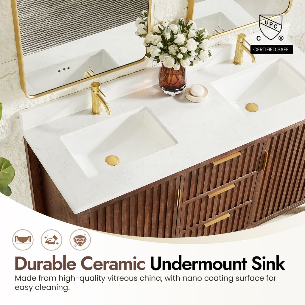 - Nano-Coated Basin: Bright white Nano anti-fouling coating ceramic undermount sink with overflow blends seamlessly with the stone vanity top.