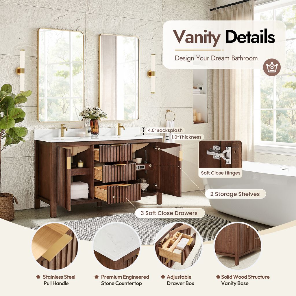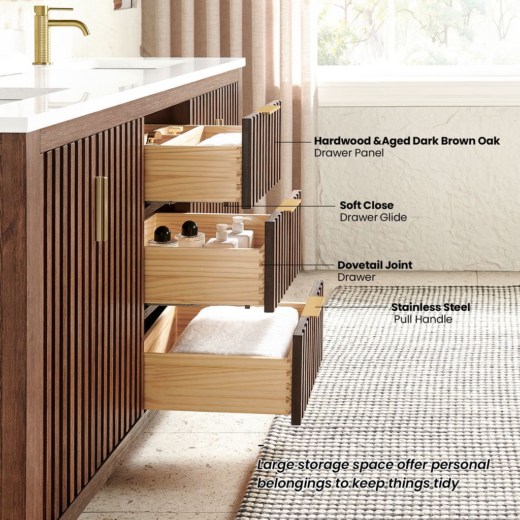 - Ample Storage Space: Two soft-closing, hand-spliced doors (door panel with anti-warping reinforcement strip) with fixed shelves and three sturdy, hand-spliced, soft-closing dovetail drawers offer ample space for all your toiletries. Built-in partition storage space in the drawer allows you to keep toiletries and other items neatly organized.