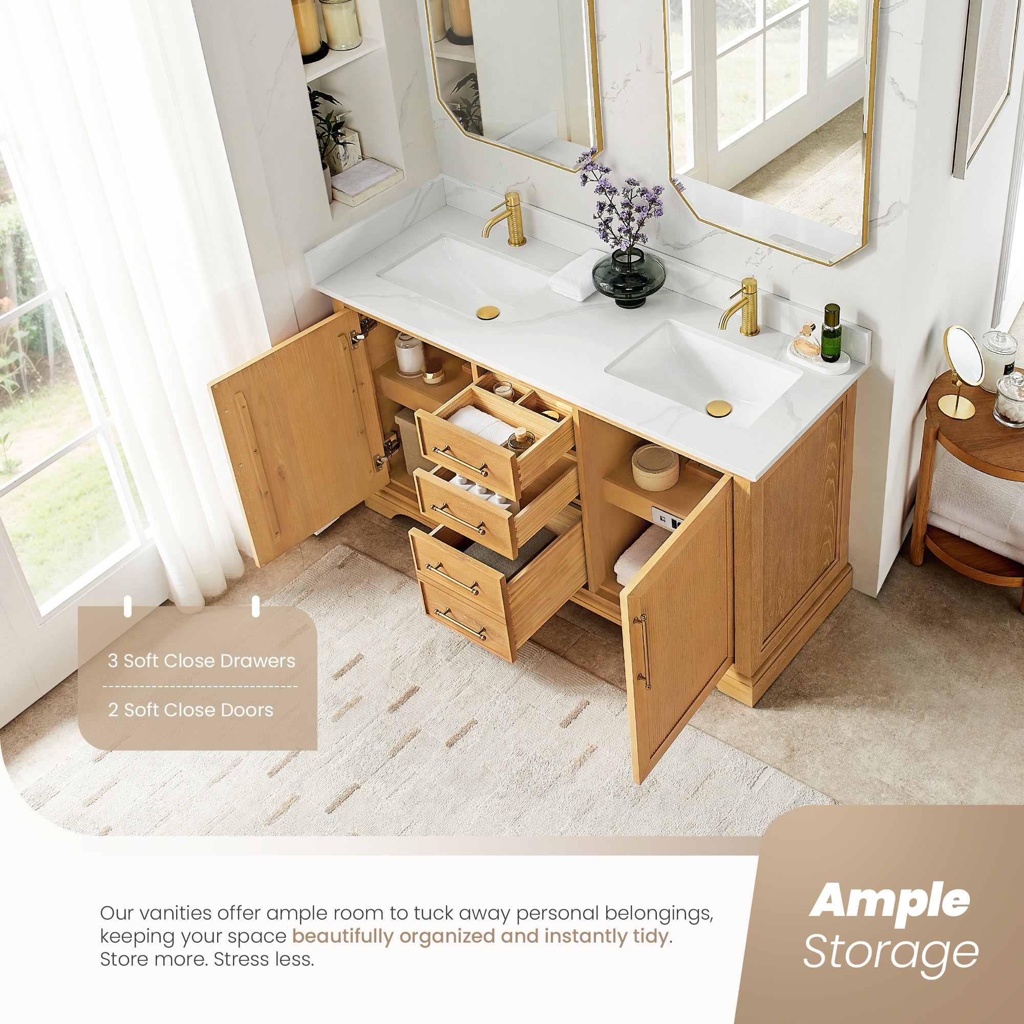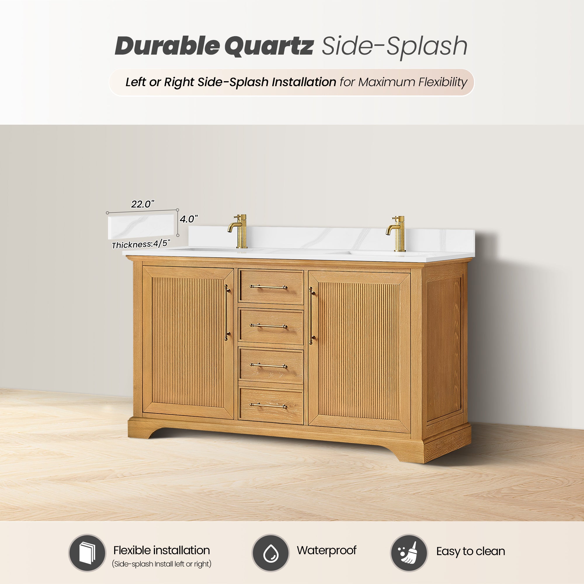 Tokyo 60" Double Bath Vanity in Oak Natural Brown with Silk White Quartz Stone Top