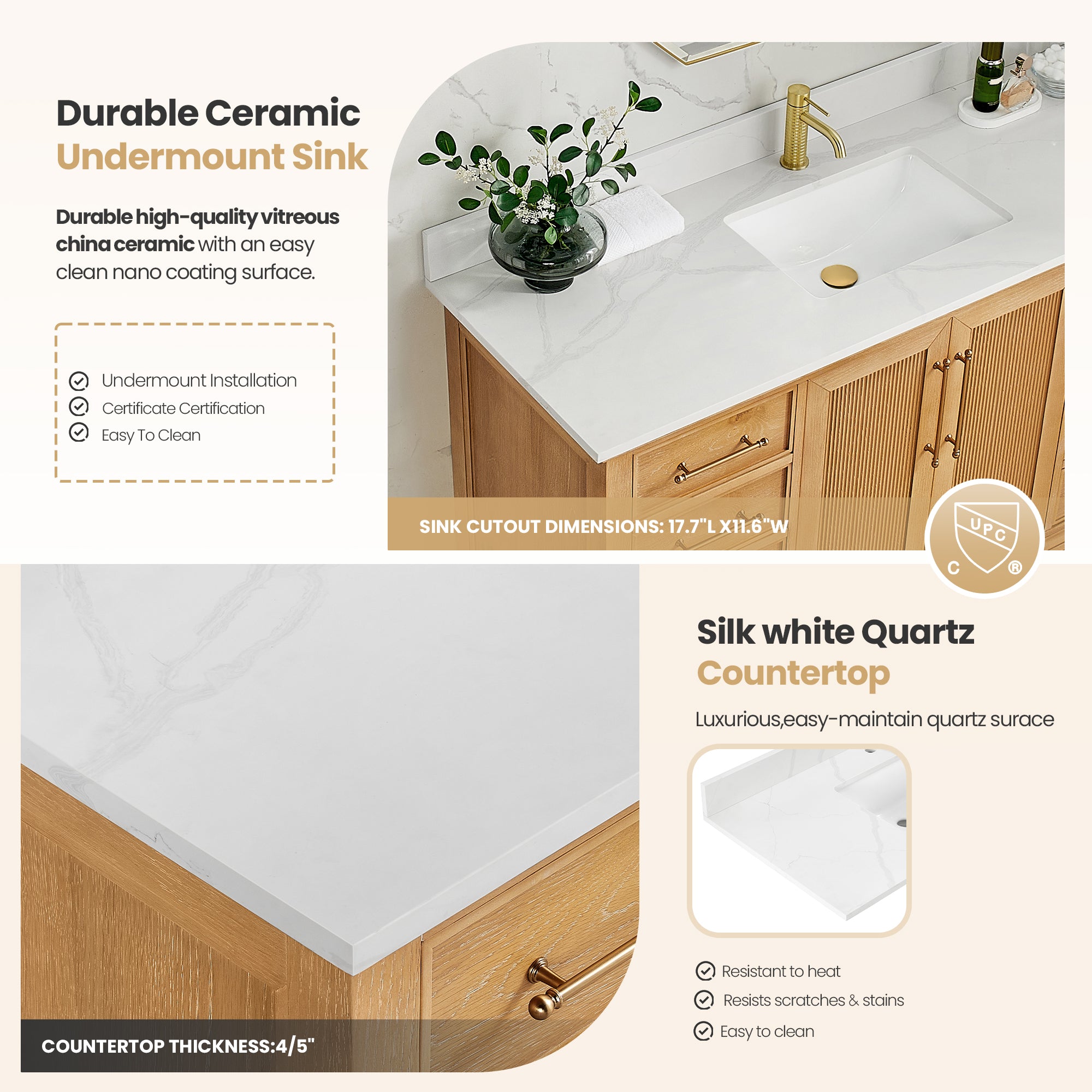 - Modern Top: The 0.8"-thick, silk white quartz stone top with 4.0"H backsplash and sidesplash lends a fresh and contemporary look, with a high-gloss, anti-fouling coating that makes it scratch-resistant, wear-resistant, and easy to clean.