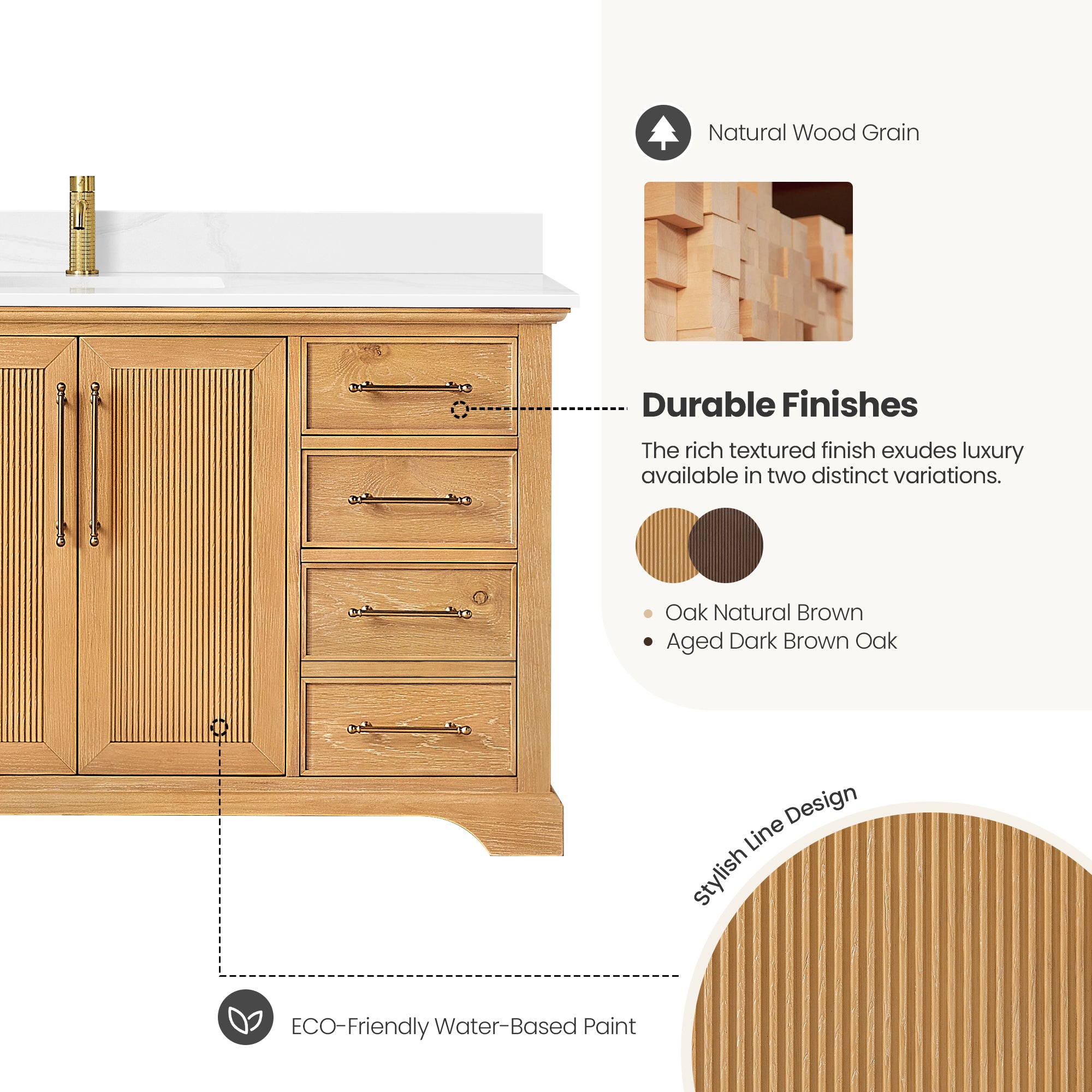 - High-Quality Hardware: Sturdy Gold handles offer a cool touch of style and contrast against the textured wood. (Handles come as shown - no customization options available)