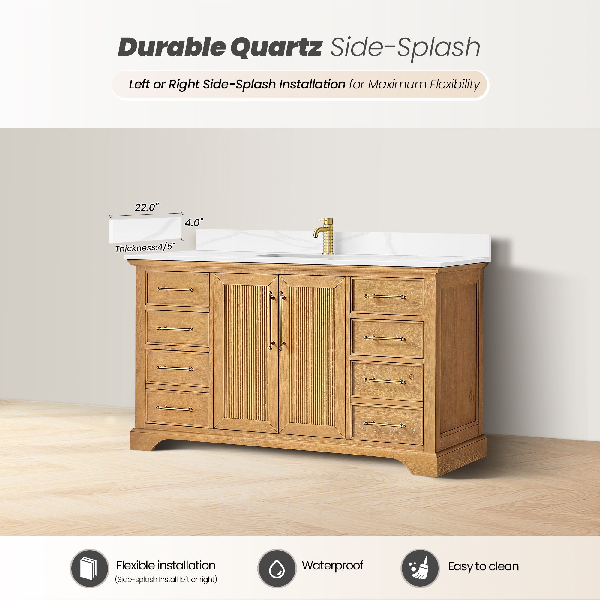 - Modern Top: The 0.8"-thick, silk white quartz stone top with 4.0"H backsplash and sidesplash lends a fresh and contemporary look, with a high-gloss, anti-fouling coating that makes it scratch-resistant, wear-resistant, and easy to clean.