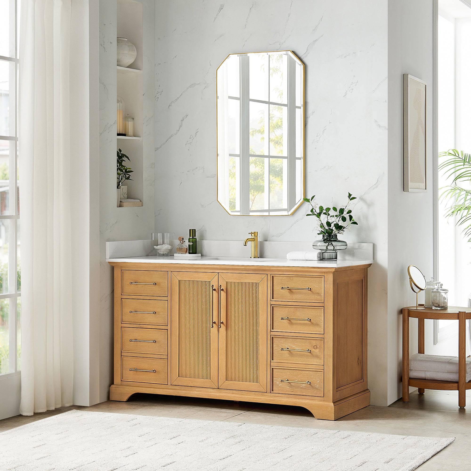 Constructed from imported solid wood, our Tokyo Series Vanity exudes classic charm with a hint of contemporary flair and blends seamlessly with a traditional or modern decor. Engineered to withstand the rigors of daily use, this piece features thoughtful storage space for all your essentials—complete with dovetail drawers, built-in organizers, and integrated power outlets. A stunning quartz top crowns the sturdy cabinet, providing an exquisite contrast with the natural wood grain texture.