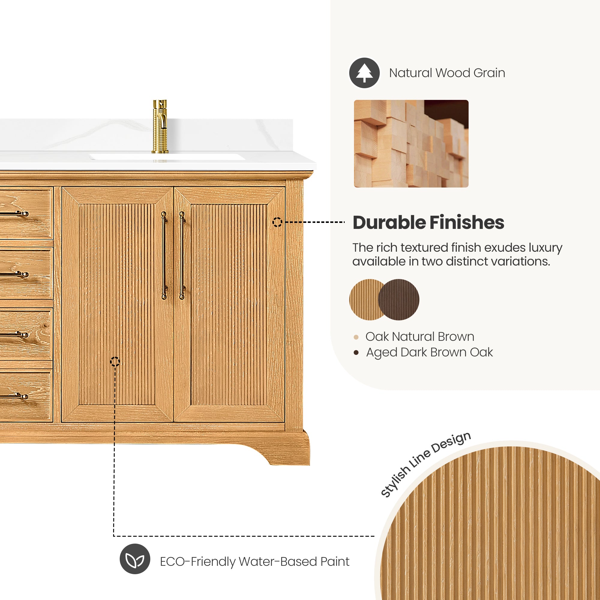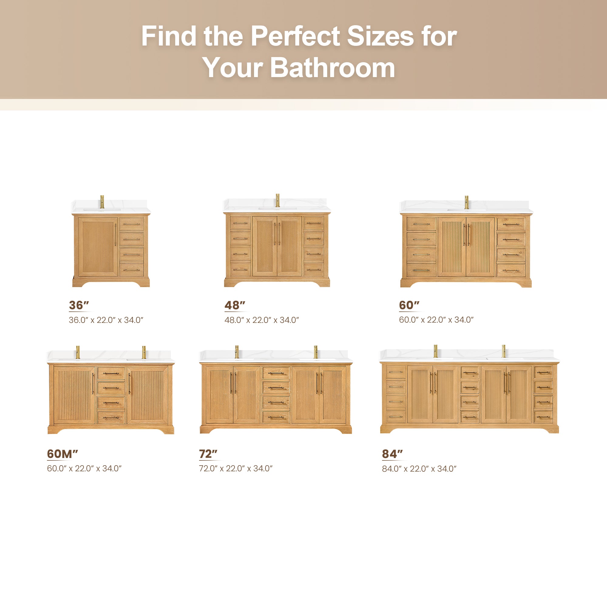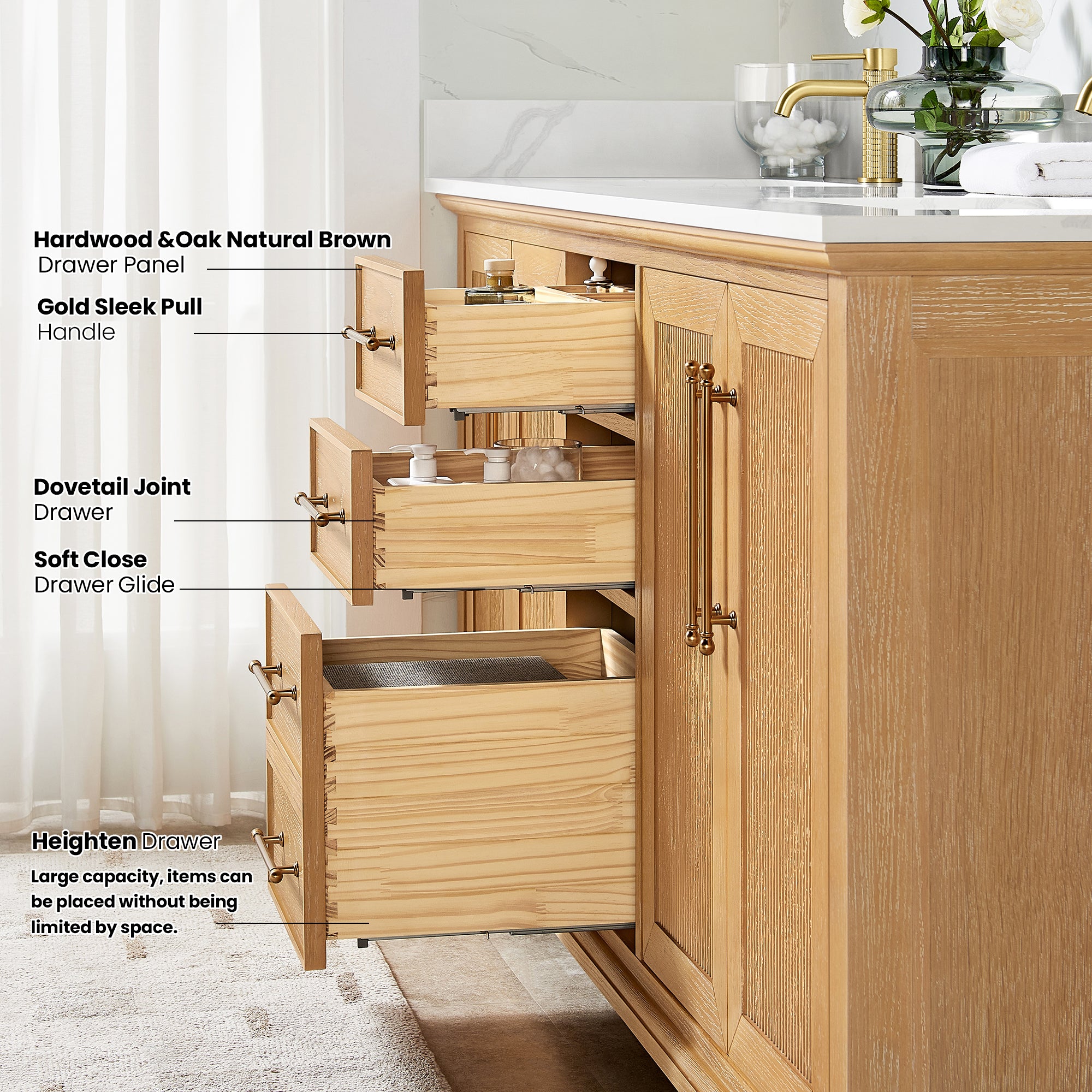Constructed from imported solid wood, our Tokyo Series Vanity exudes classic charm with a hint of contemporary flair and blends seamlessly with a traditional or modern decor. Engineered to withstand the rigors of daily use, this piece features thoughtful storage space for all your essentials—complete with dovetail drawers, built-in organizers, and integrated power outlets. A stunning quartz top crowns the sturdy cabinet, providing an exquisite contrast with the natural wood grain texture.
