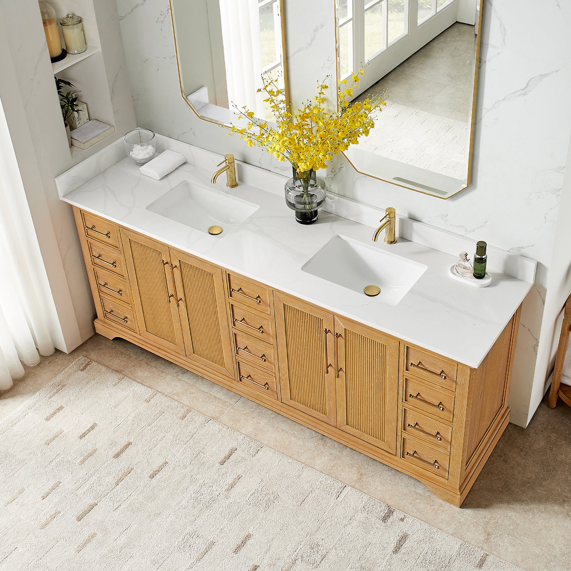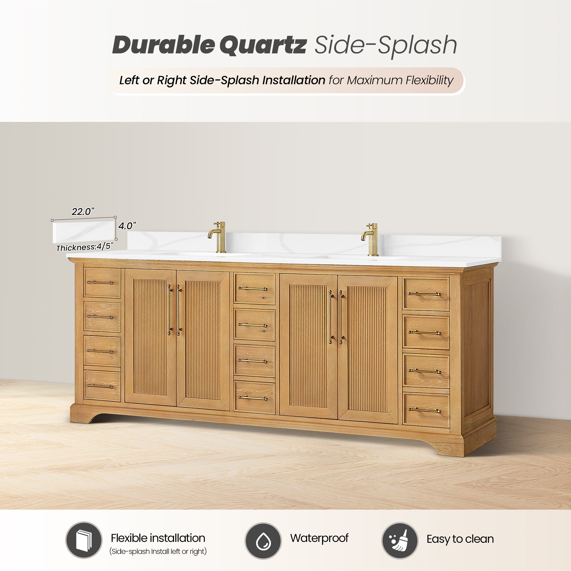 Tokyo 84" Double Bath Vanity in Oak Natural Brown with Silk White Quartz Stone Top