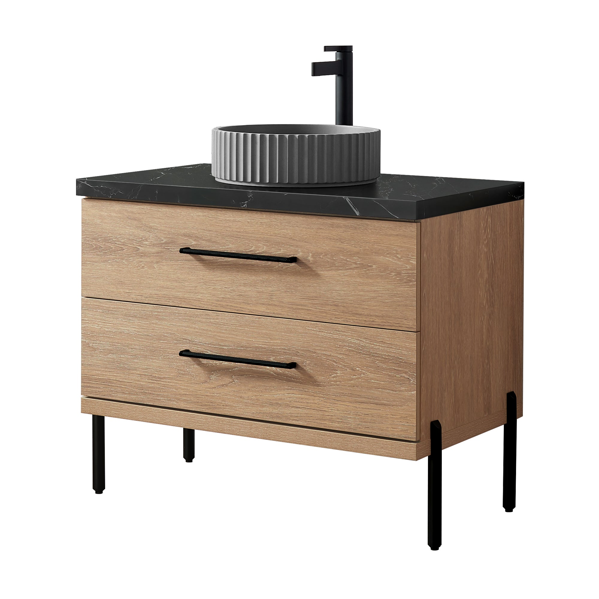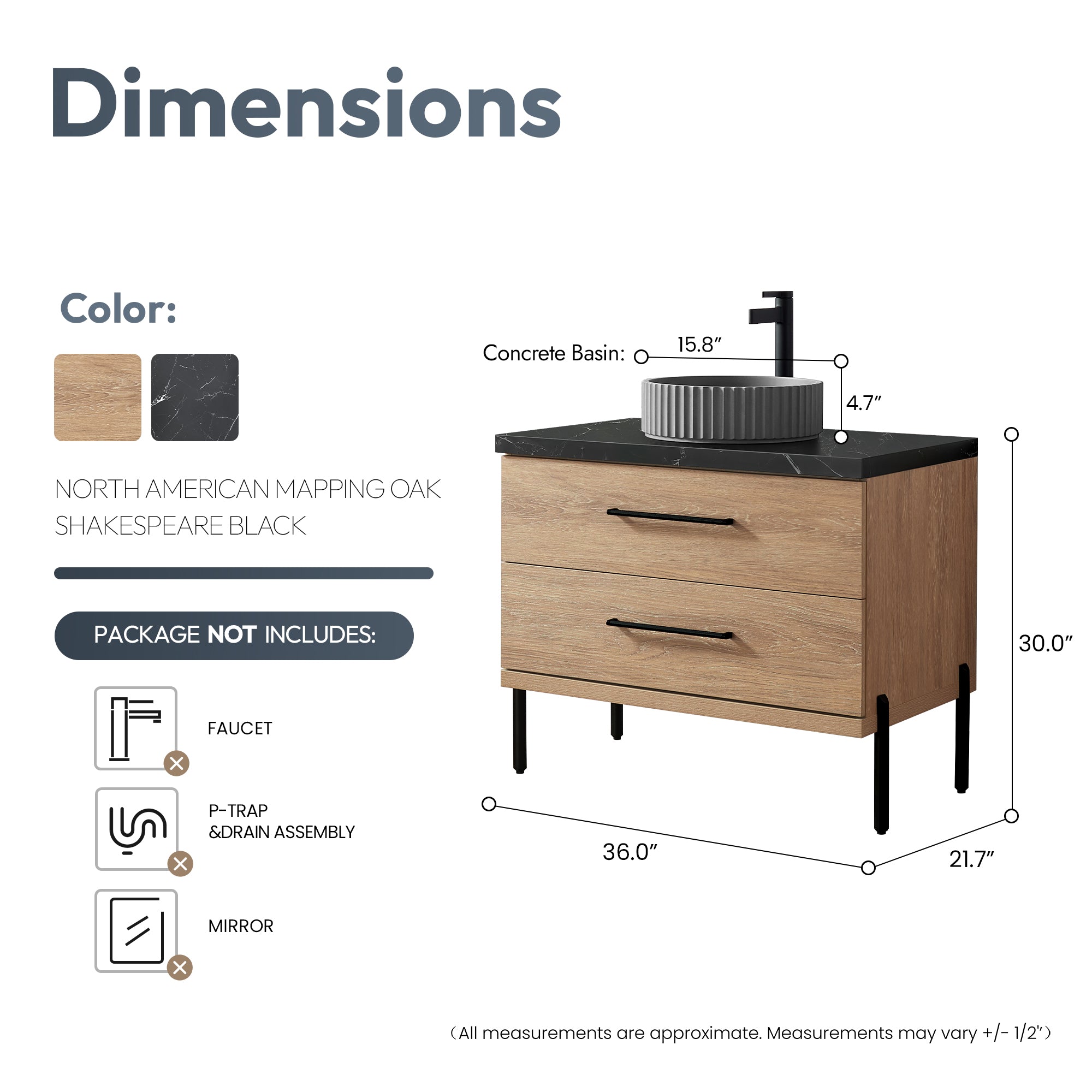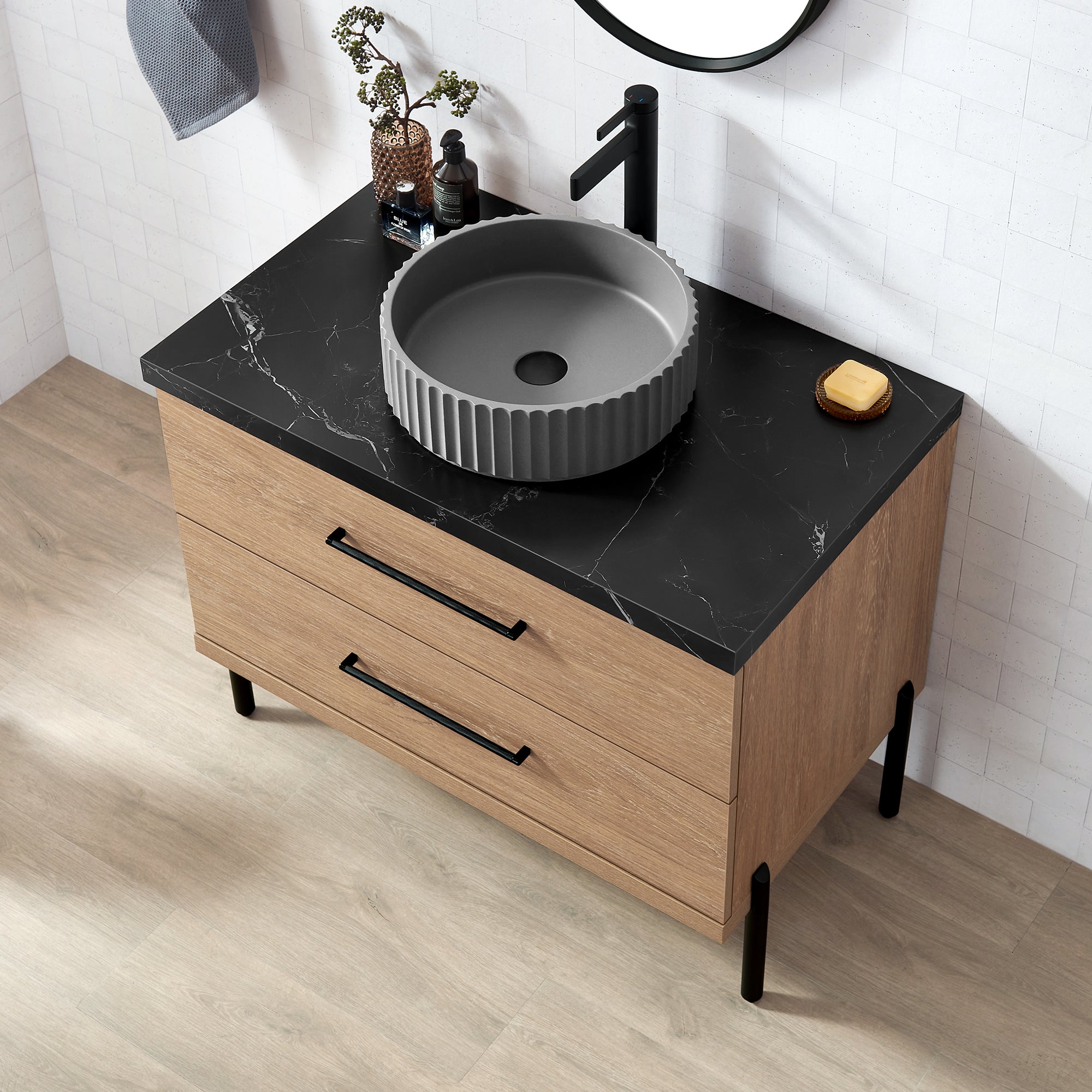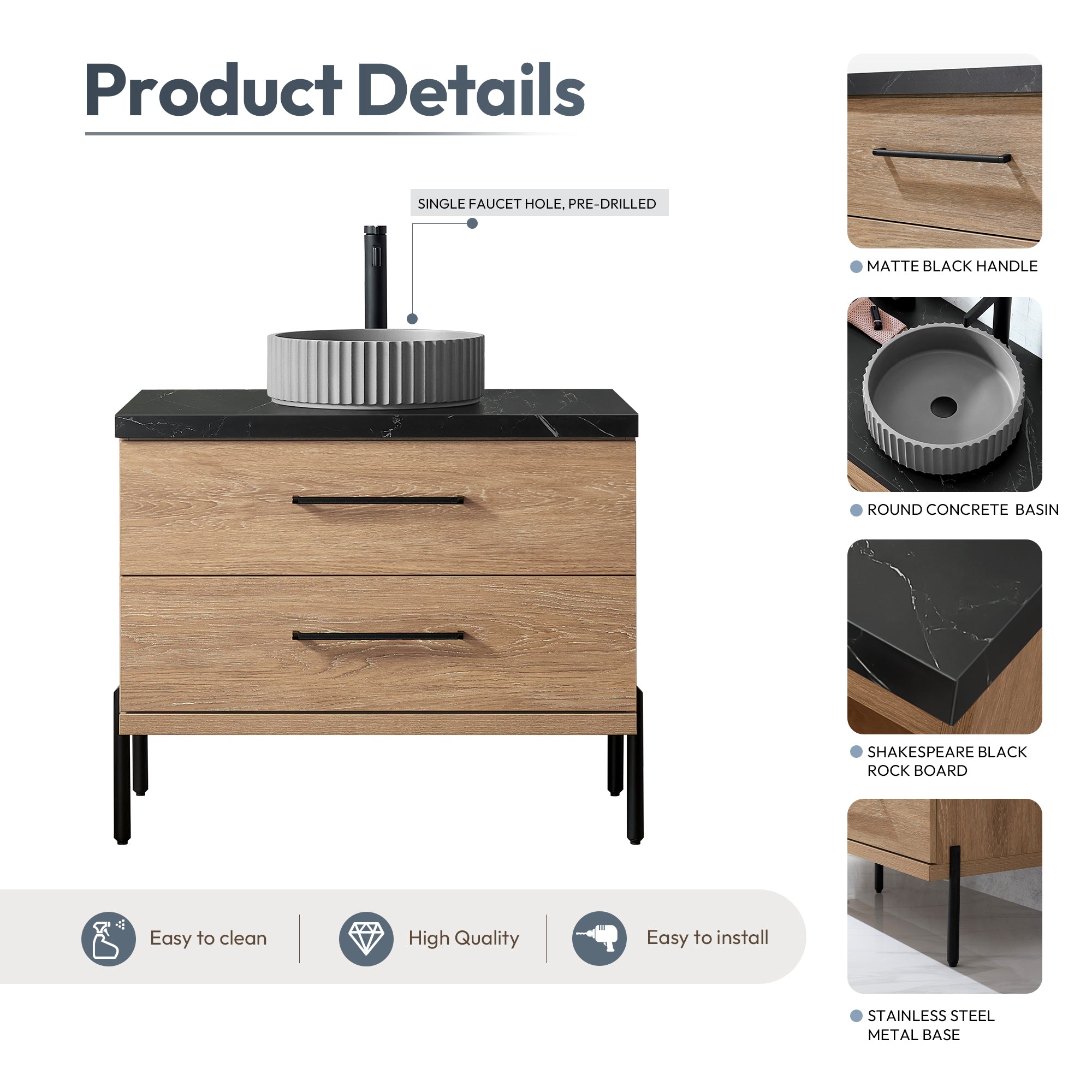 Trento 36B" Single Sink Bath Vanity in North American Oak with Black Sintered Stone Top and Circular Concrete Sink