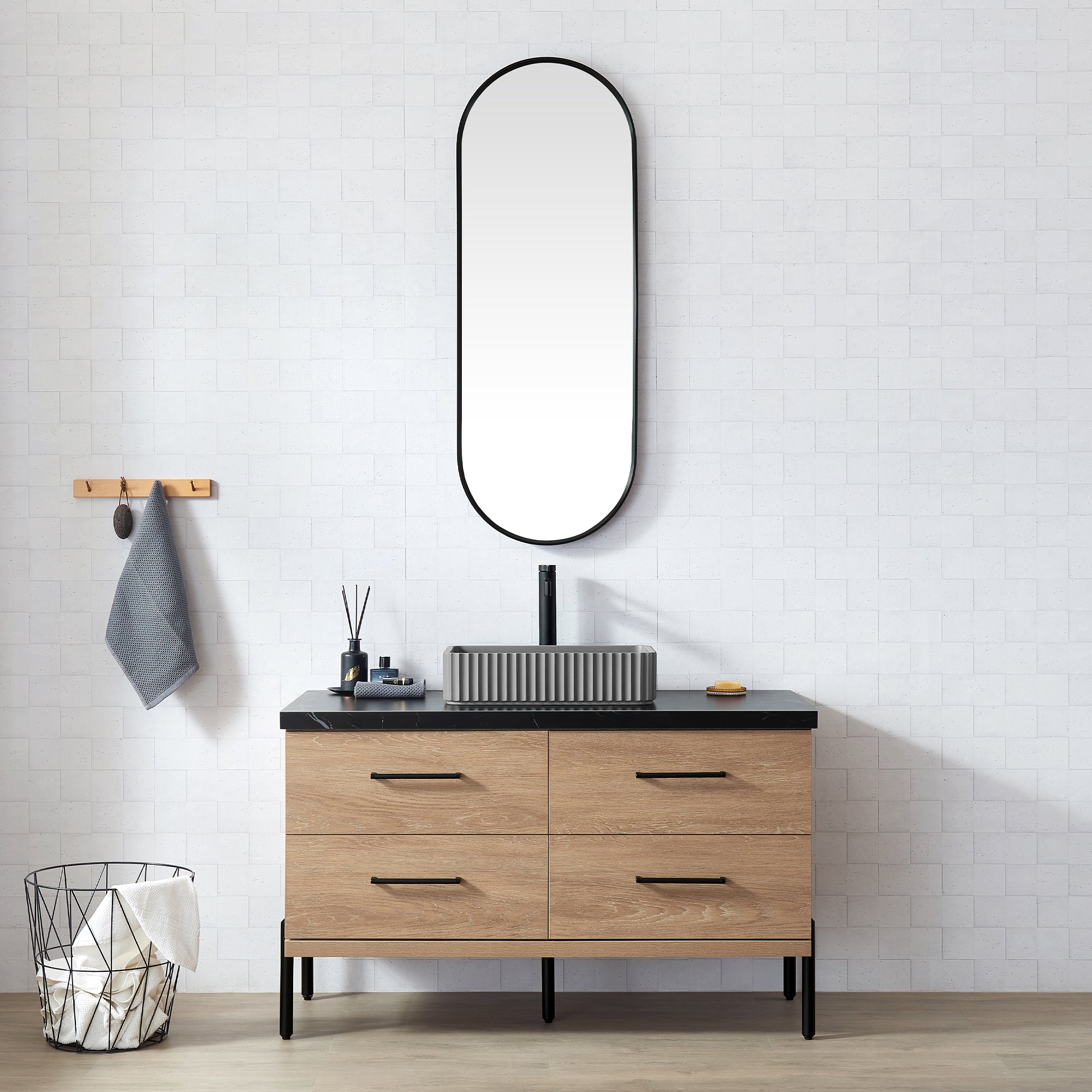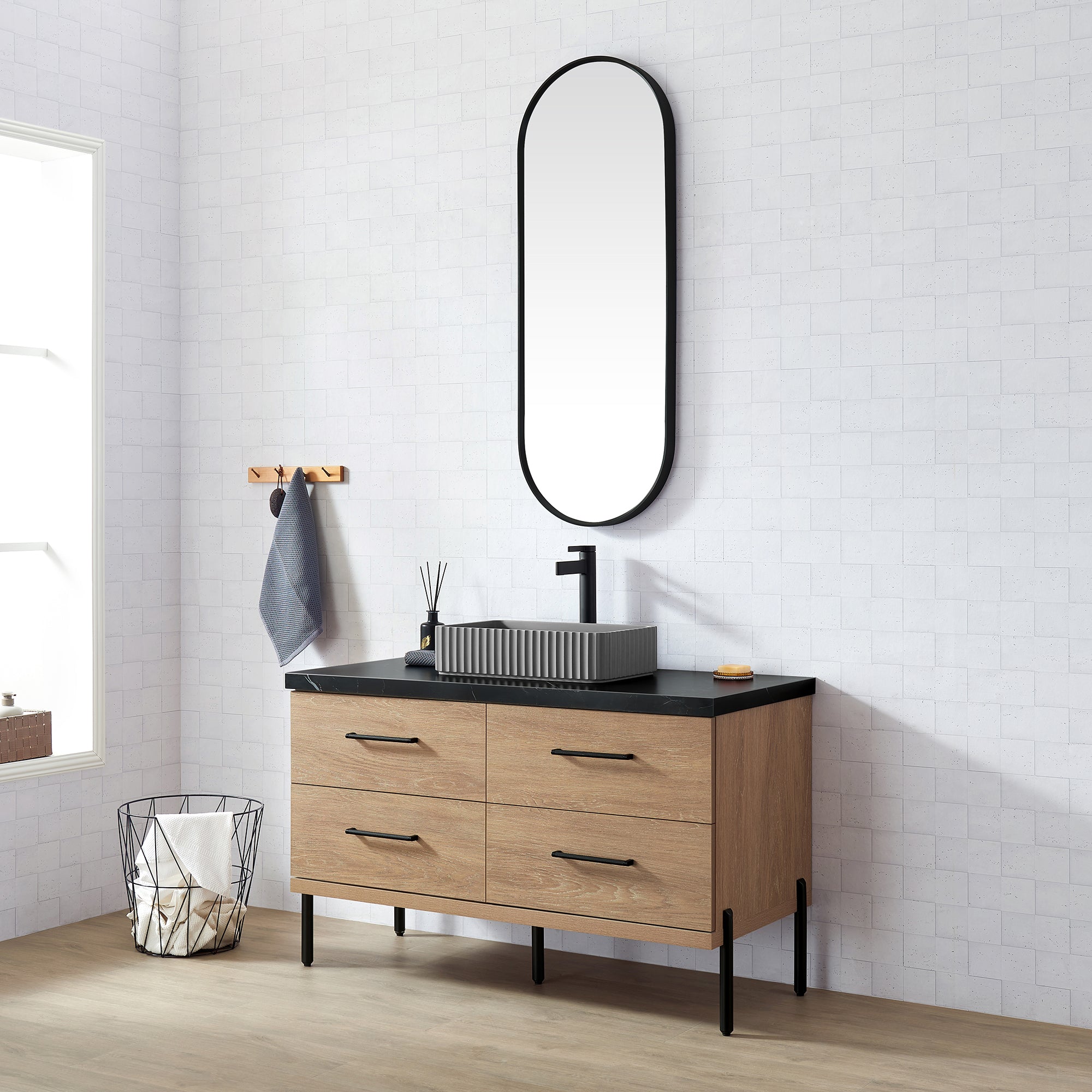 Trento 48A" Single Sink Bath Vanity in North American Oak with Black Sintered Stone Top and Rectangular Concrete Sink