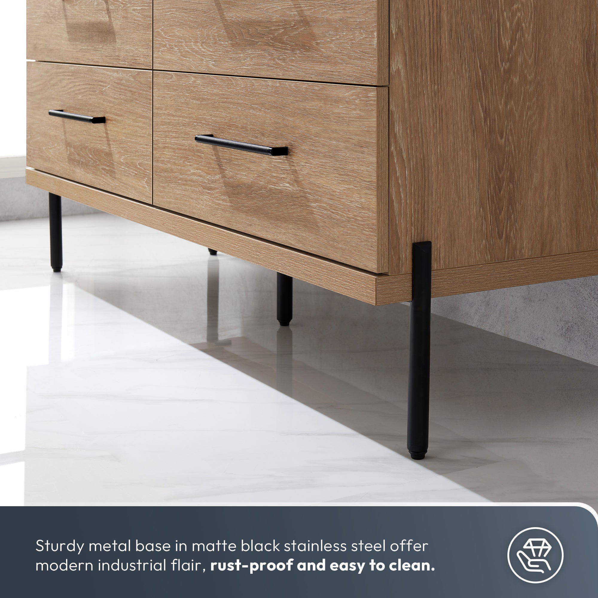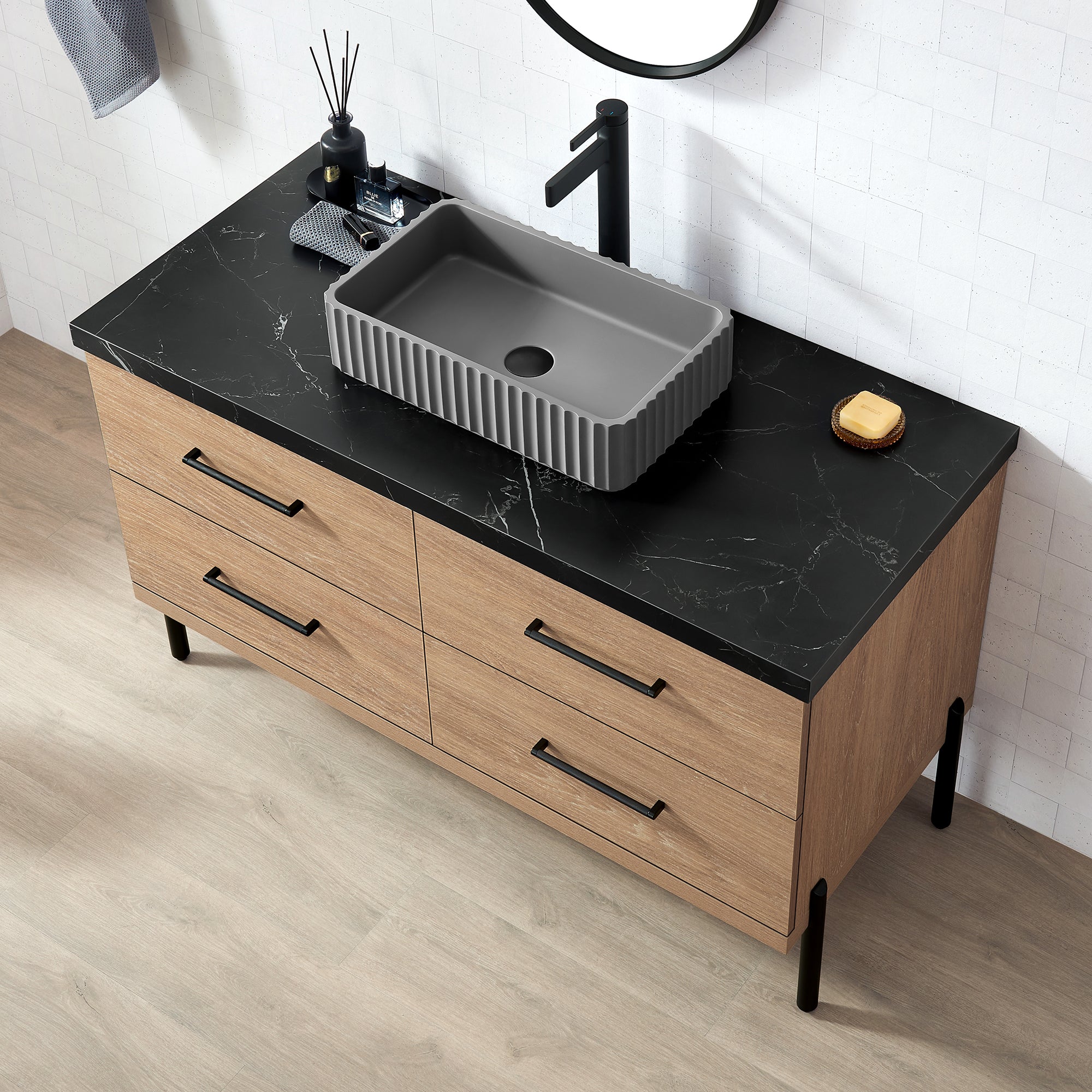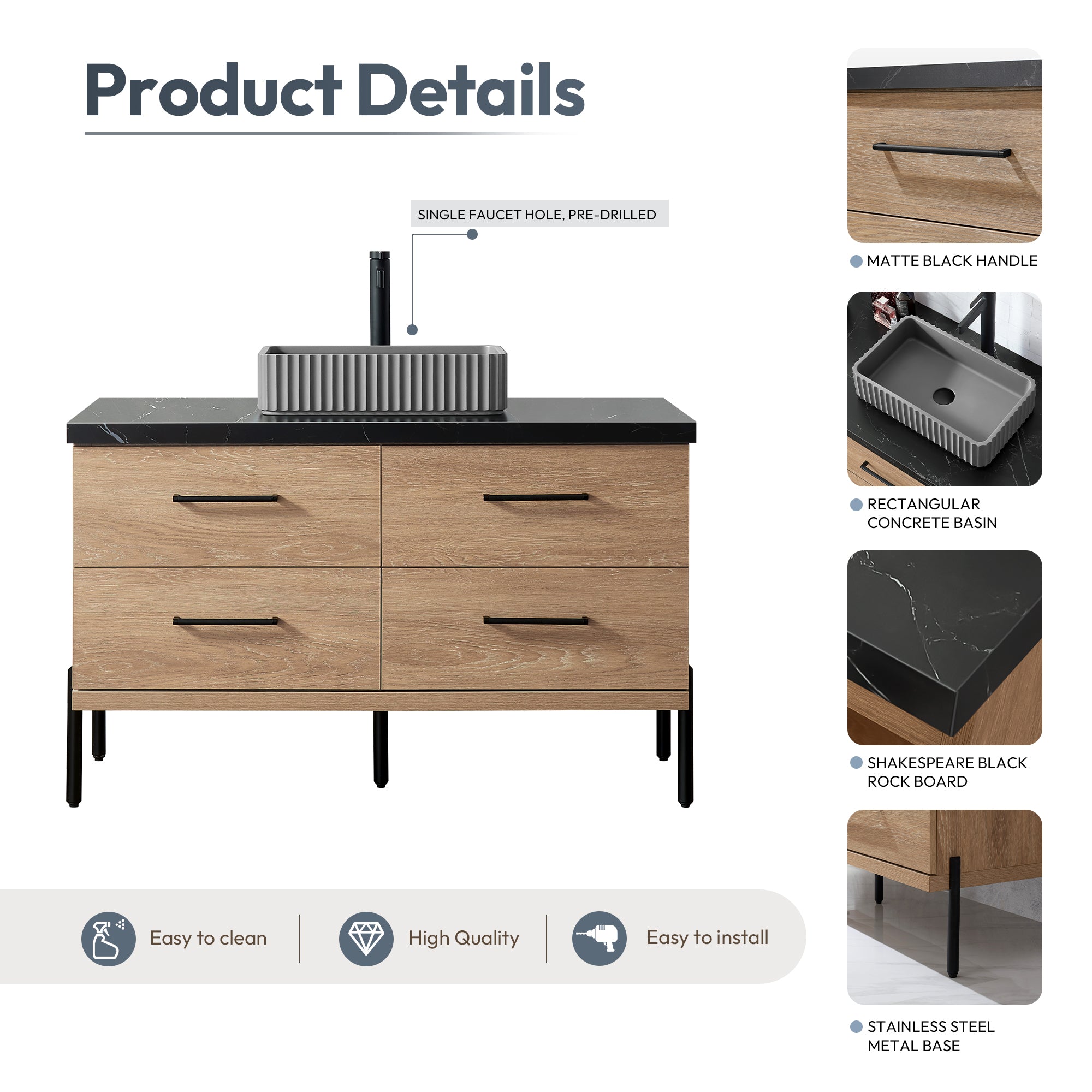 - Freestanding bathroom vanity (without back panel) comes partially assembled for your convenience; Matte Black support feet must be installed.