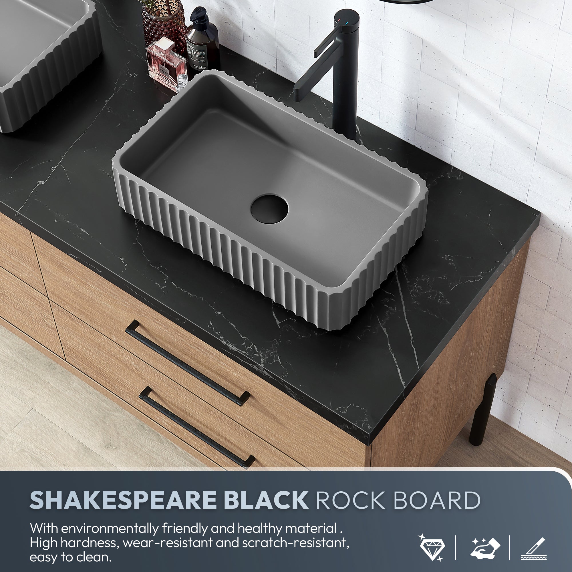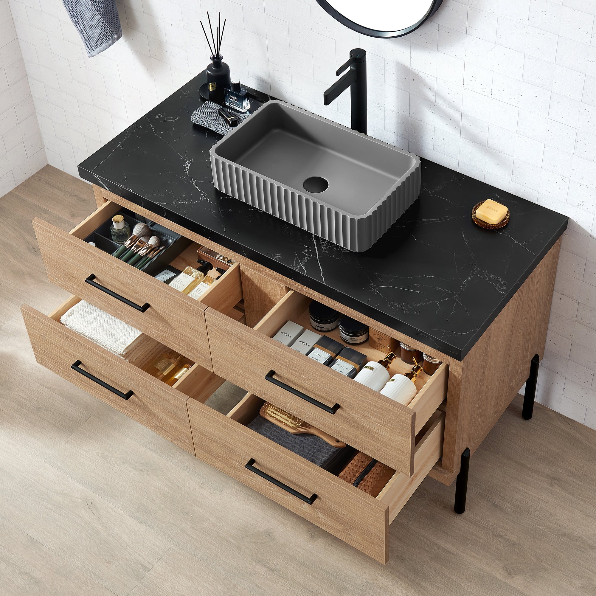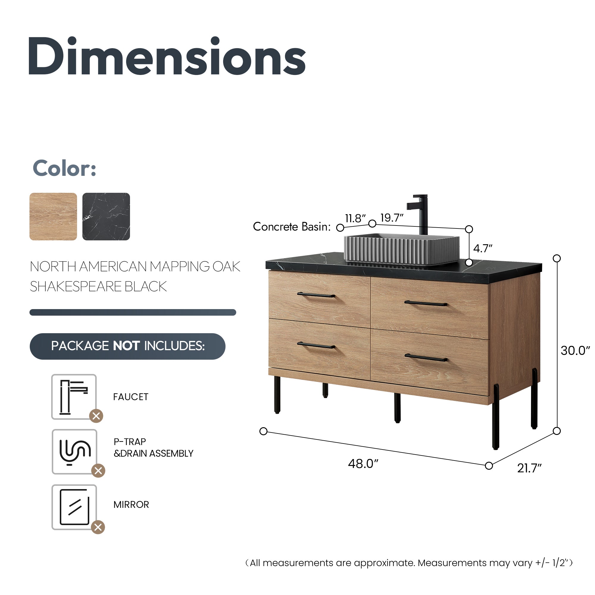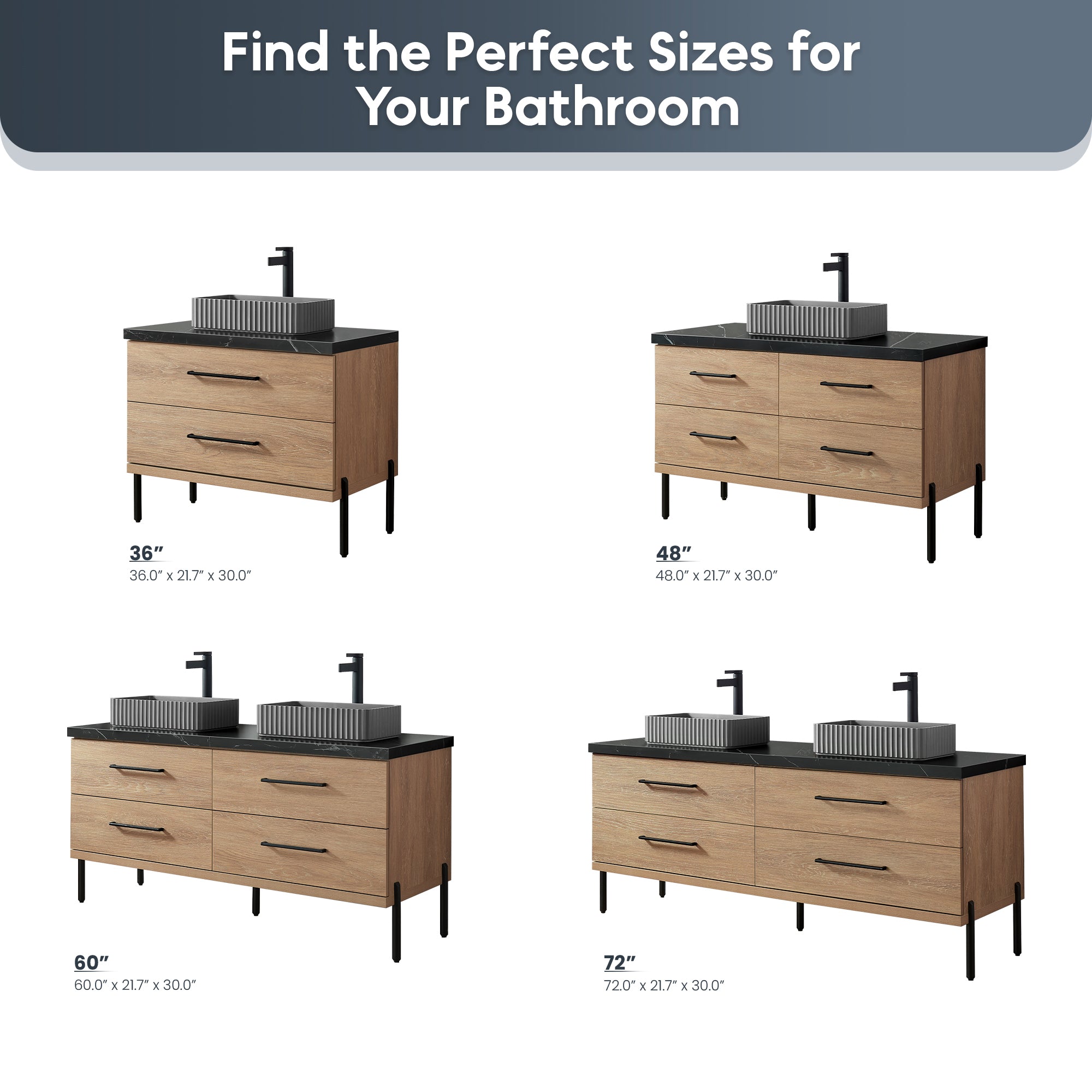 - Freestanding bathroom vanity (without back panel) comes partially assembled for your convenience; Matte Black support feet must be installed.