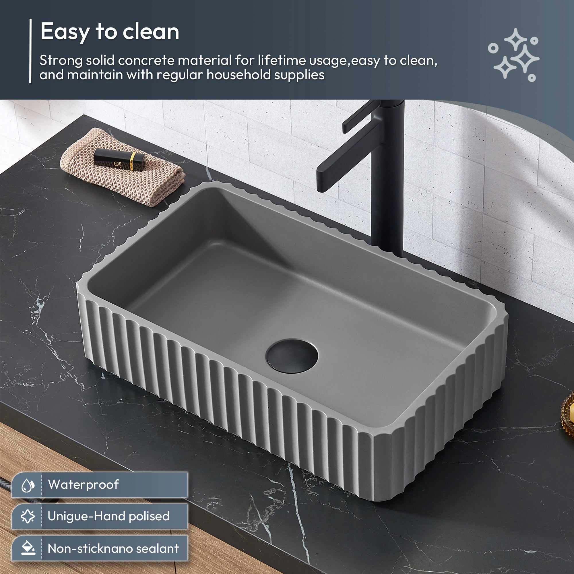 - "Customize the look of your vanity by choosing the unique concrete sink style you prefer (6 matching basins to choose from):(9257-BAS-GR(C): Circular Concrete sink / (9258-BAS-GR(O): Oval Concrete sink / (9260-BAS-GR(R): Circular Concrete sink / (9259-BAS-GR(S): Rectangular Concrete sink / (9261-BAS-GR(A): Rectangular Concrete sink / (9262-BAS-GR(B): Circular Concrete sink"