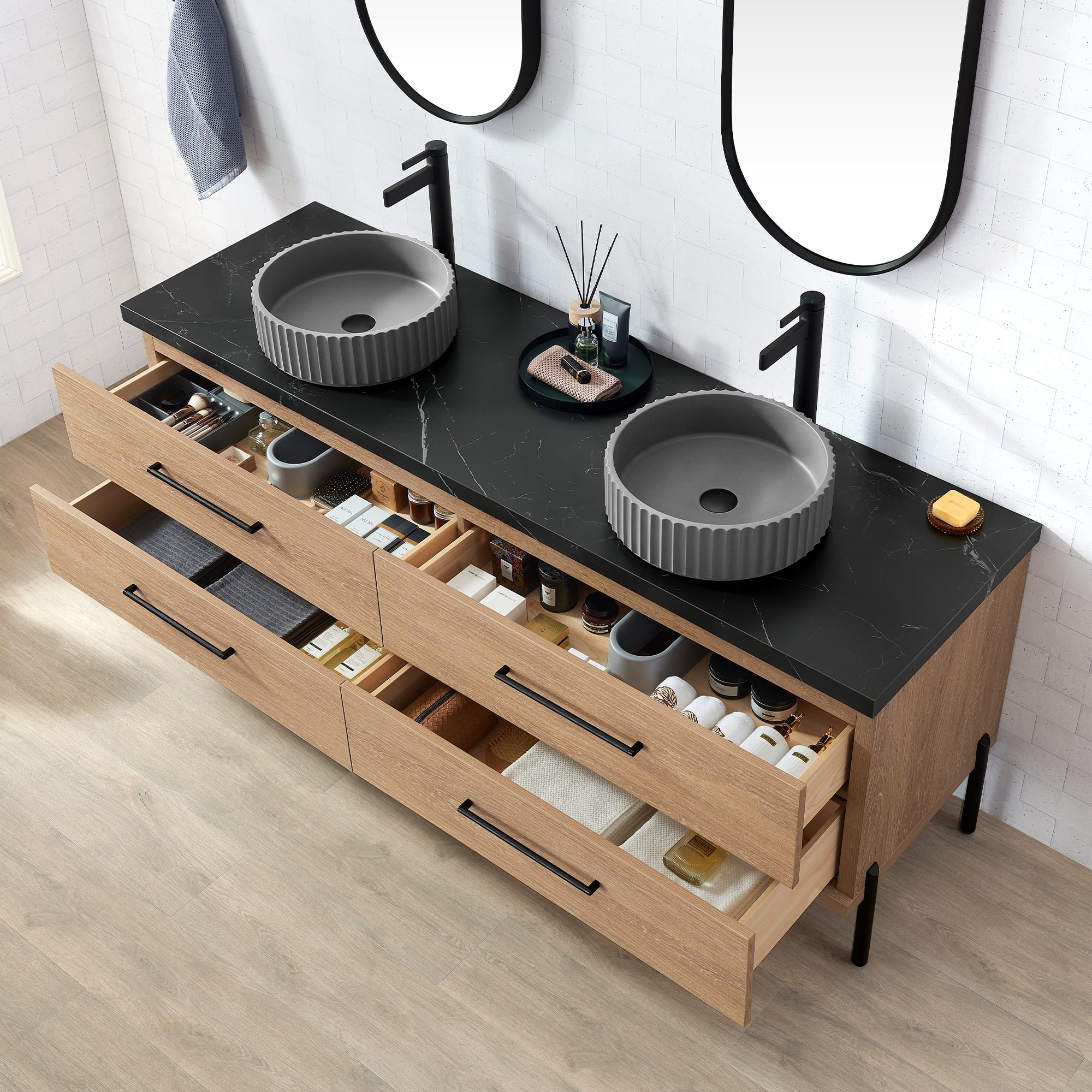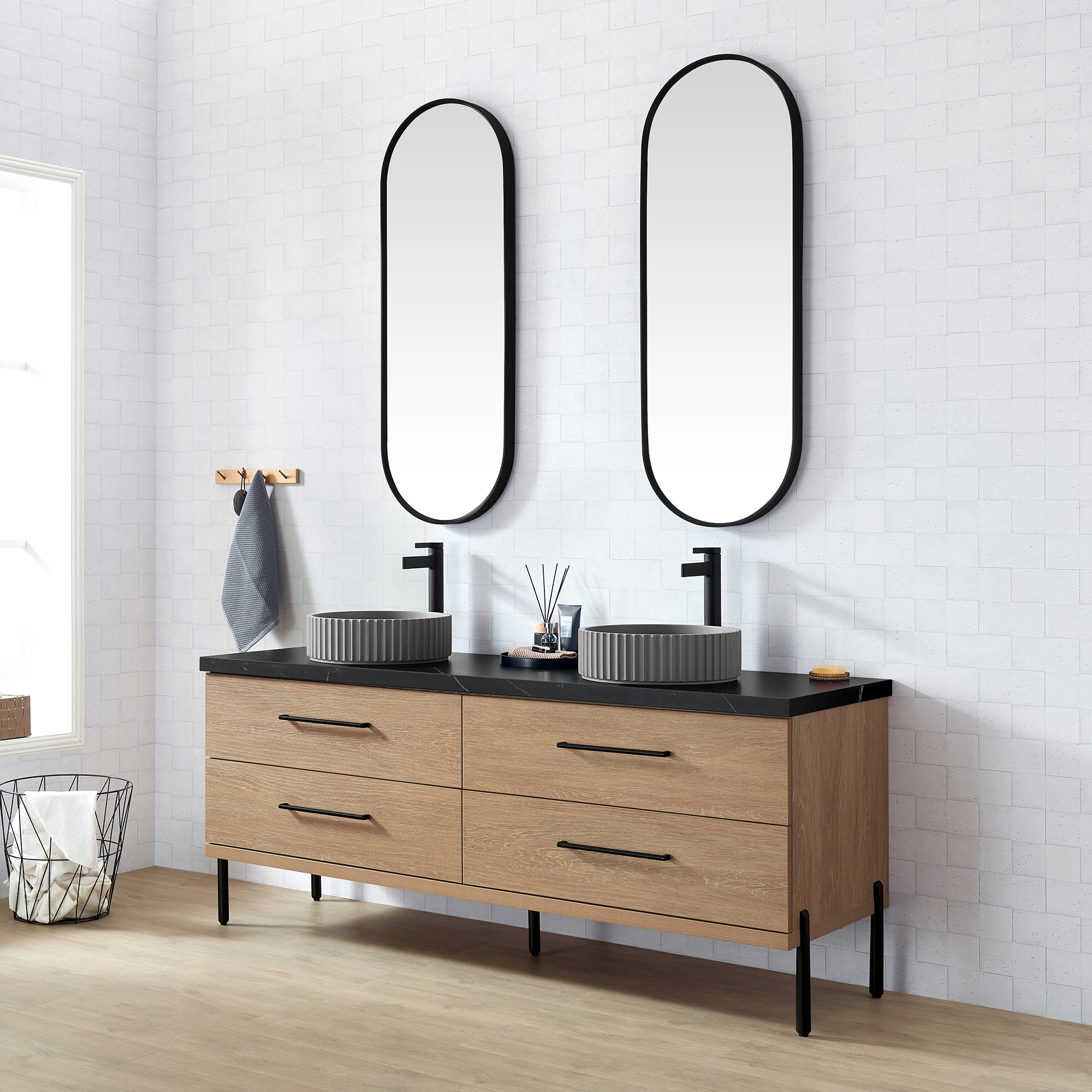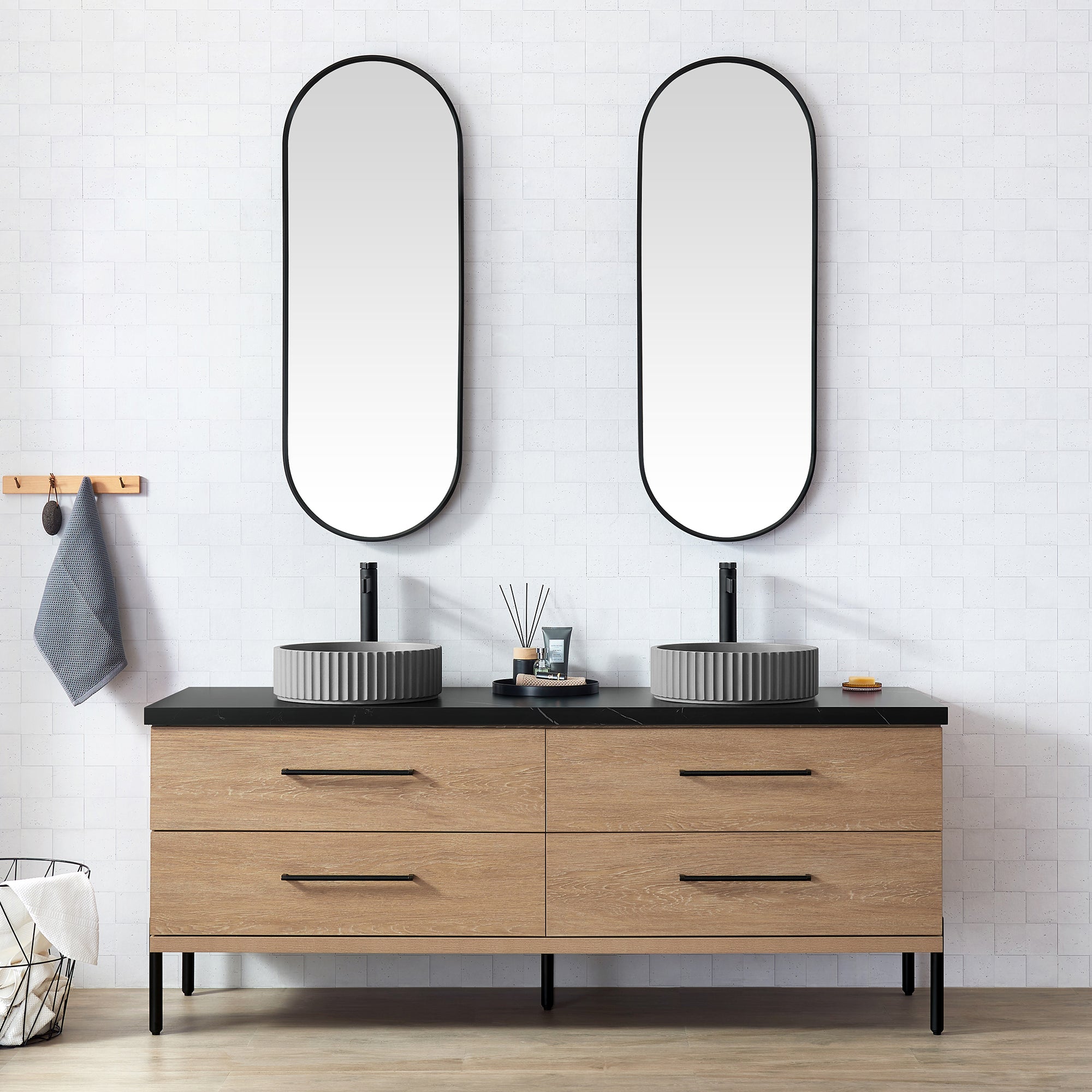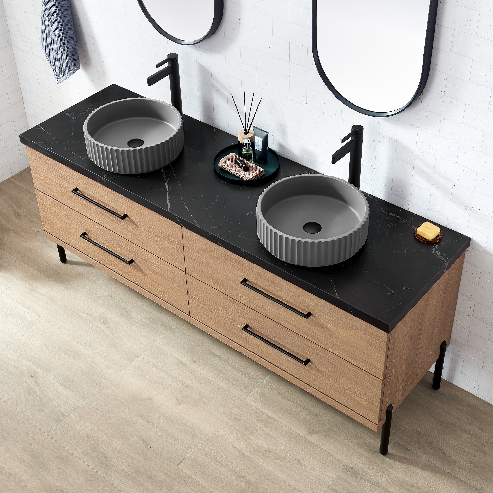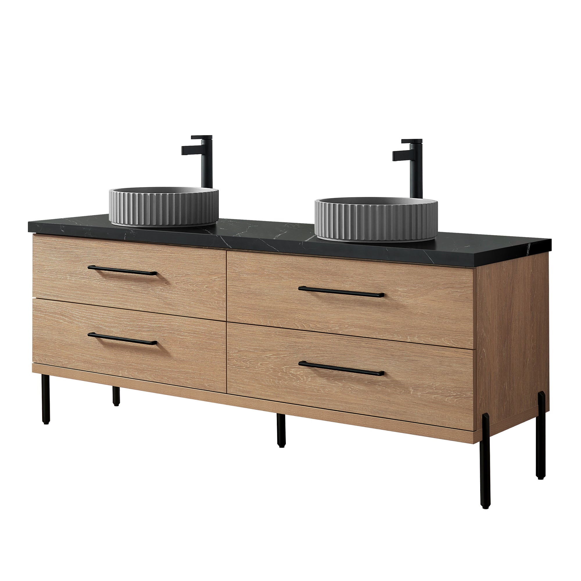 Trento 72B" Double Sink Bath Vanity in North American Oak with Black Sintered Stone Top and Circular Concrete Sink