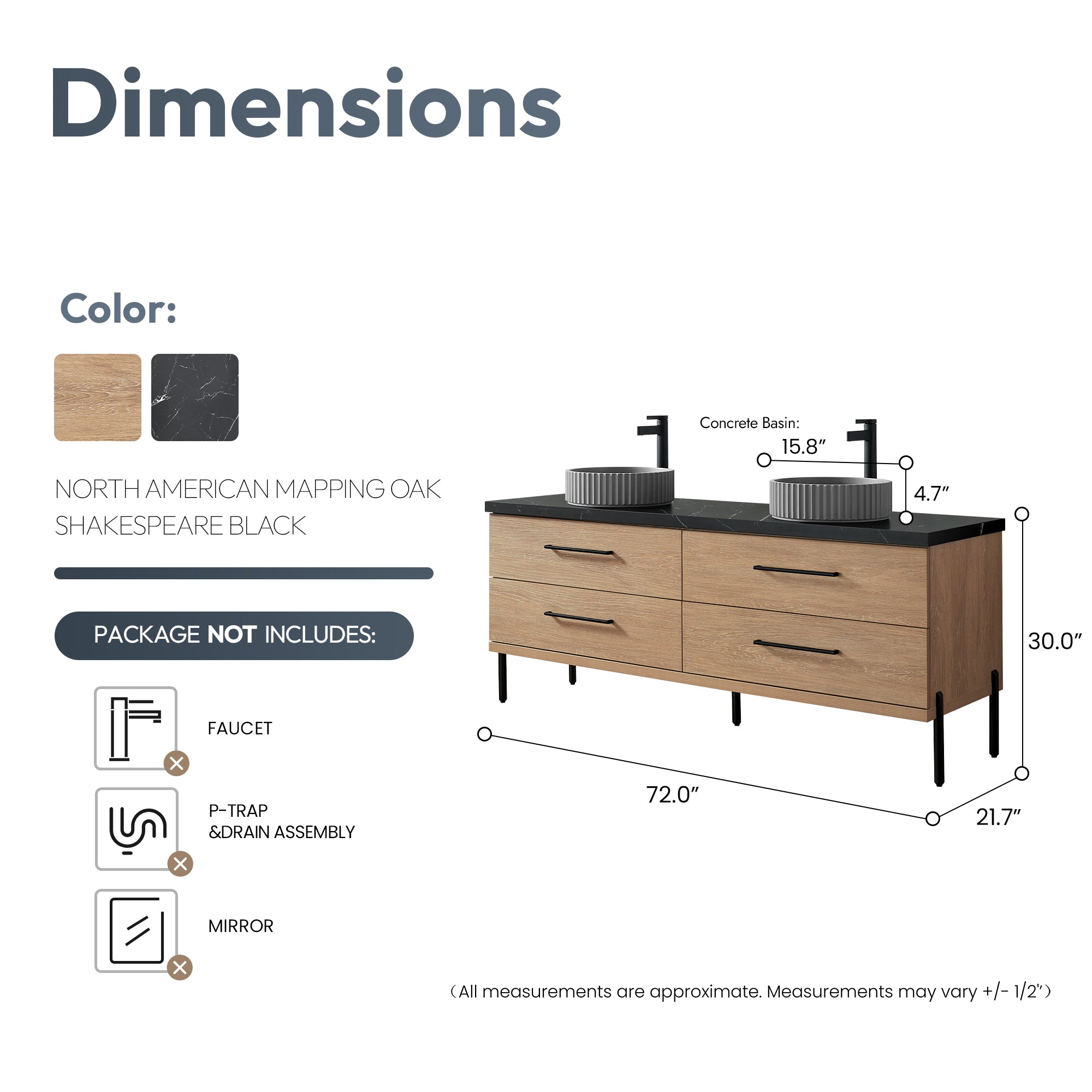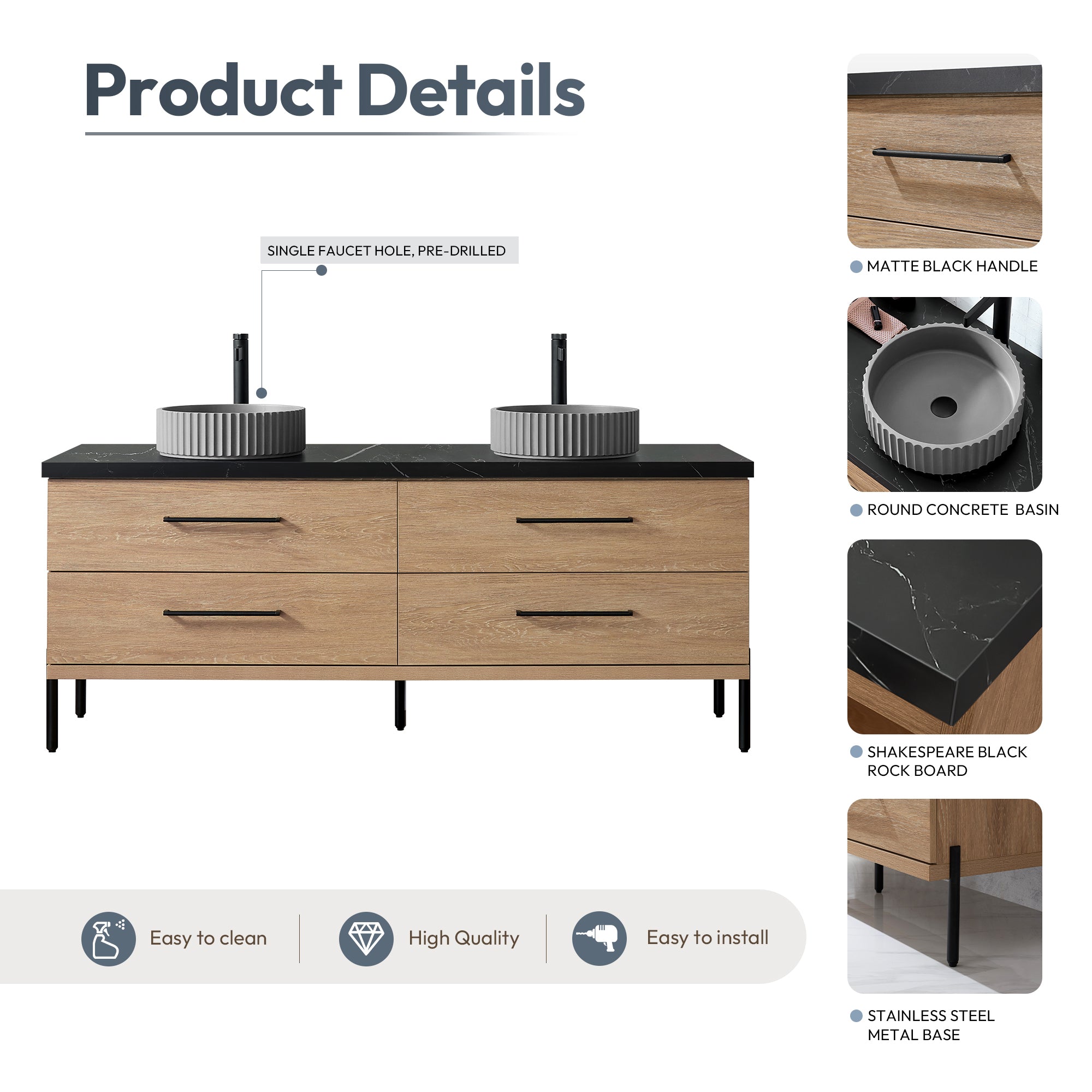 - Freestanding bathroom vanity (without back panel) comes partially assembled for your convenience; Matte Black support feet must be installed.