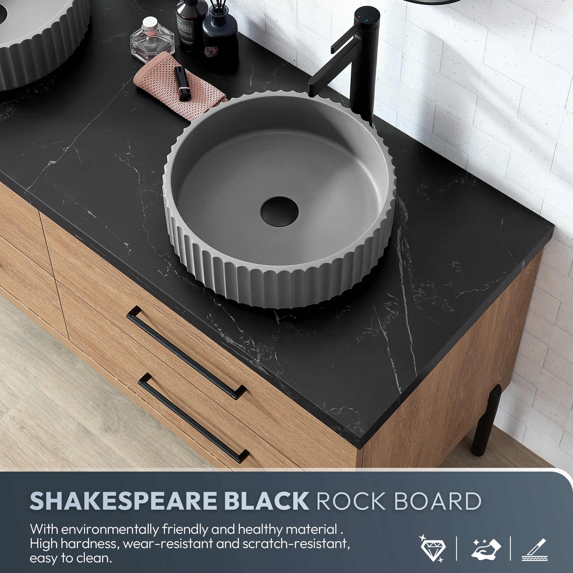 - "Customize the look of your vanity by choosing the unique concrete sink style you prefer (6 matching basins to choose from):(9257-BAS-GR(C): Circular Concrete sink / (9258-BAS-GR(O): Oval Concrete sink / (9260-BAS-GR(R): Circular Concrete sink / (9259-BAS-GR(S): Rectangular Concrete sink / (9261-BAS-GR(A): Rectangular Concrete sink / (9262-BAS-GR(B): Circular Concrete sink"