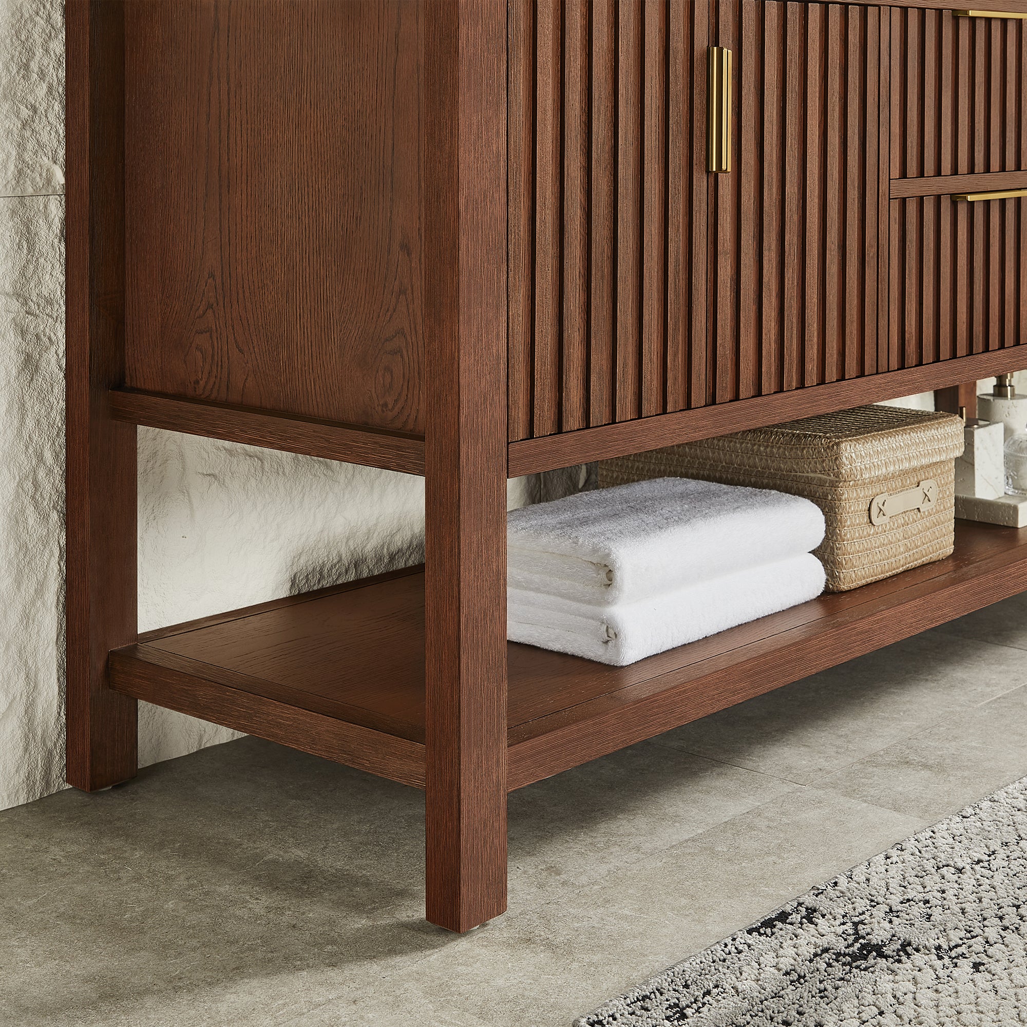 - Ample Storage Space: Two soft-closing, hand-spliced doors (door panel with anti-warping reinforcement strip) and four sturdy, hand-spliced, soft-closing dovetail drawers offer ample space for all your toiletries. Fixed bottom shelves and built-in partition storage space in the drawers allow you to keep toiletries and other items neatly organized.