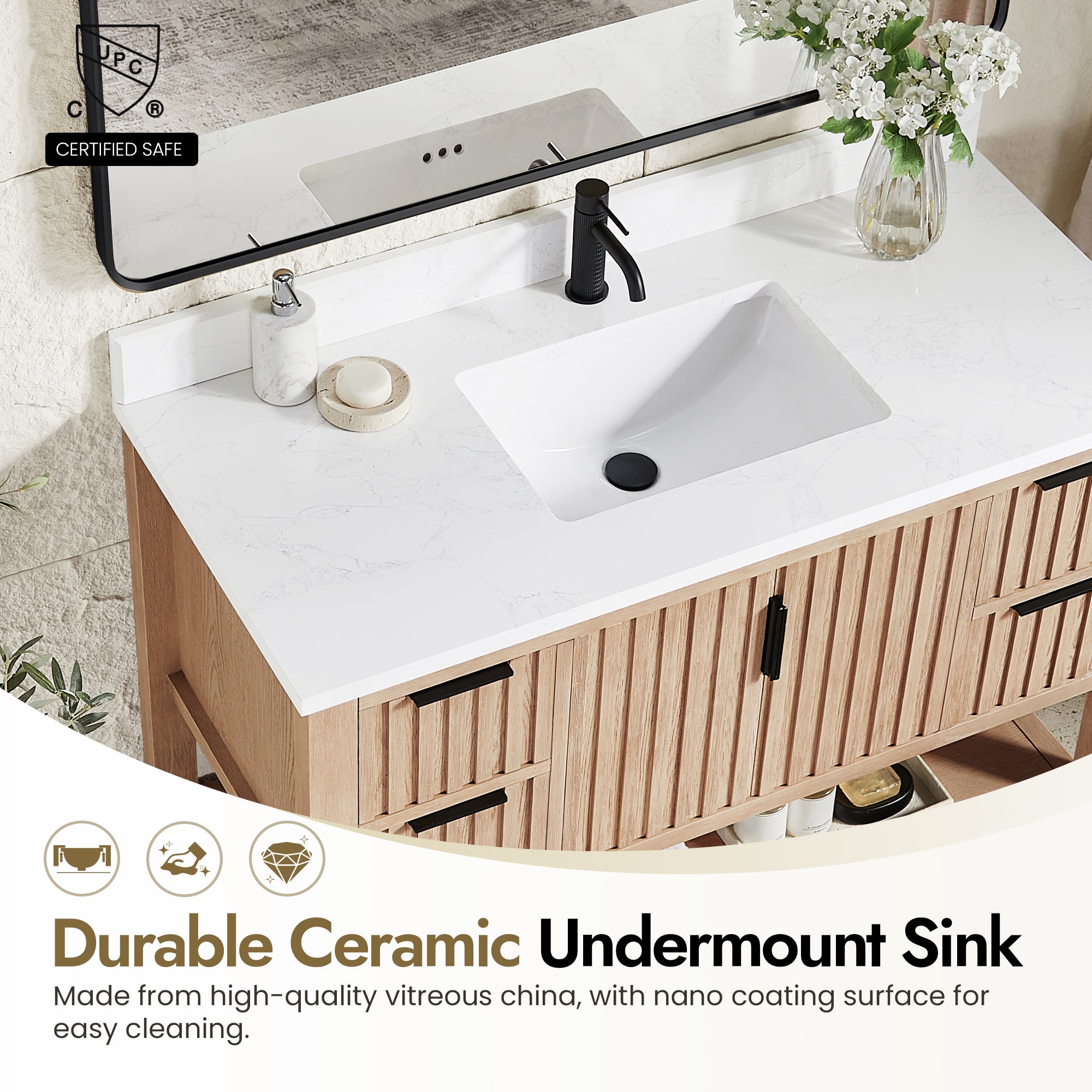 - Nano-Coated Basin: Bright white Nano anti-fouling coating ceramic undermount sink with overflow blends seamlessly with the stone vanity top.