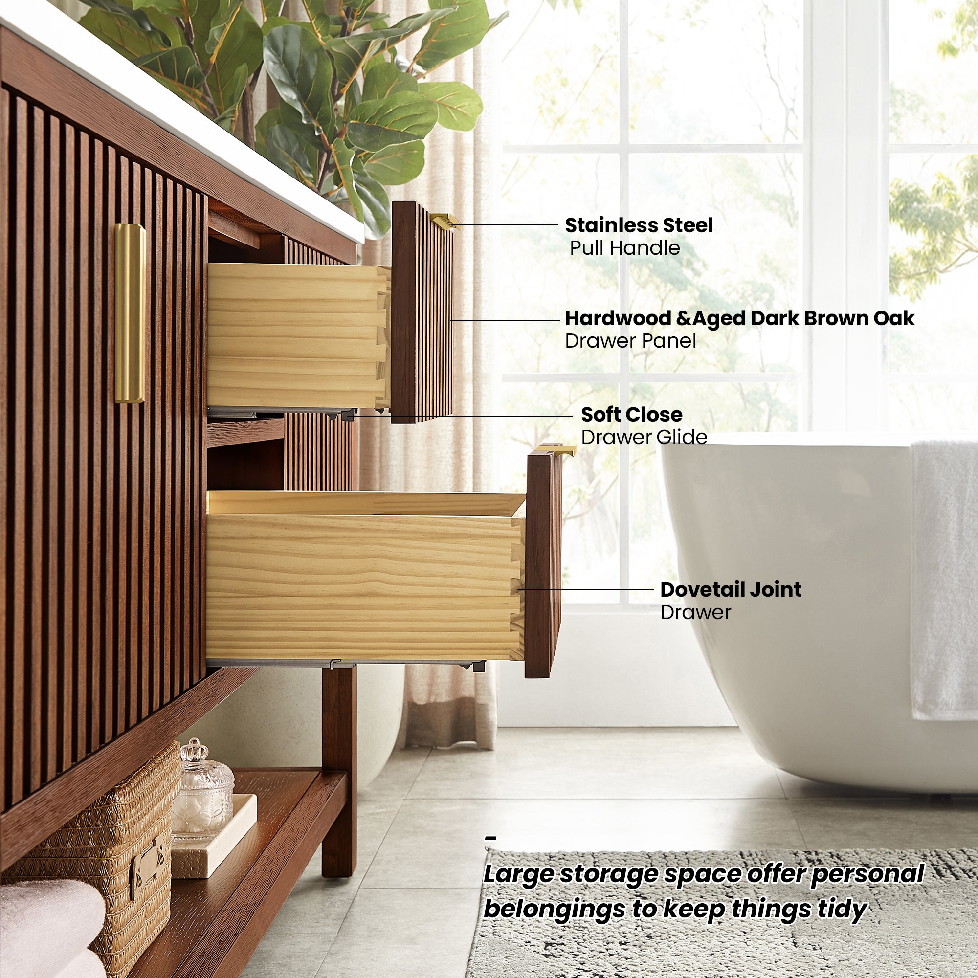 - Ample Storage Space: Two soft-closing, hand-spliced doors (door panel with anti-warping reinforcement strip) and two sturdy, hand-spliced, soft-closing dovetail drawers offer ample space for all your toiletries. Fixed bottom shelves and built-in partition storage space in the drawers allow you to keep toiletries and other items neatly organized.