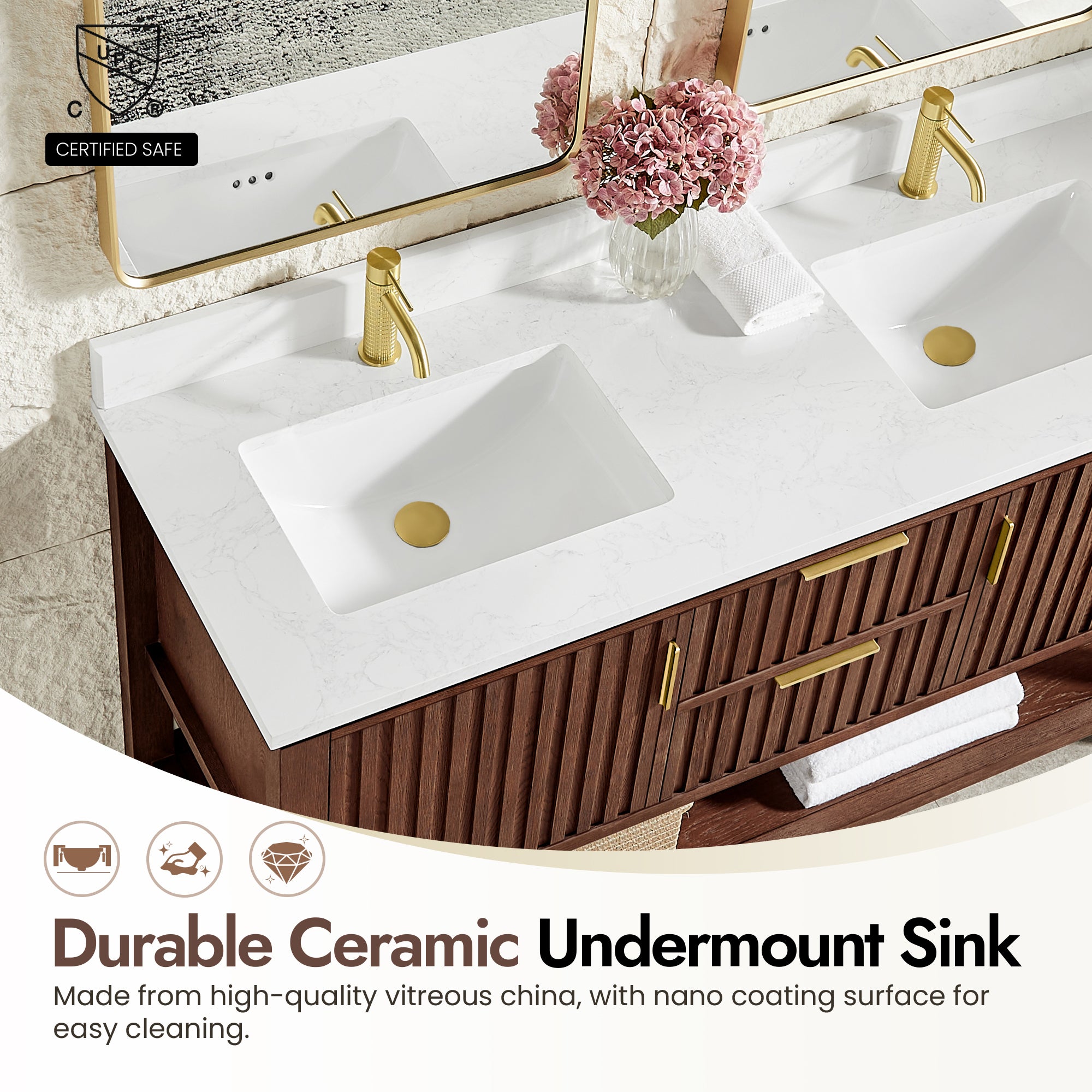 - Nano-Coated Basin: Bright white Nano anti-fouling coating ceramic undermount sink with overflow blends seamlessly with the stone vanity top.